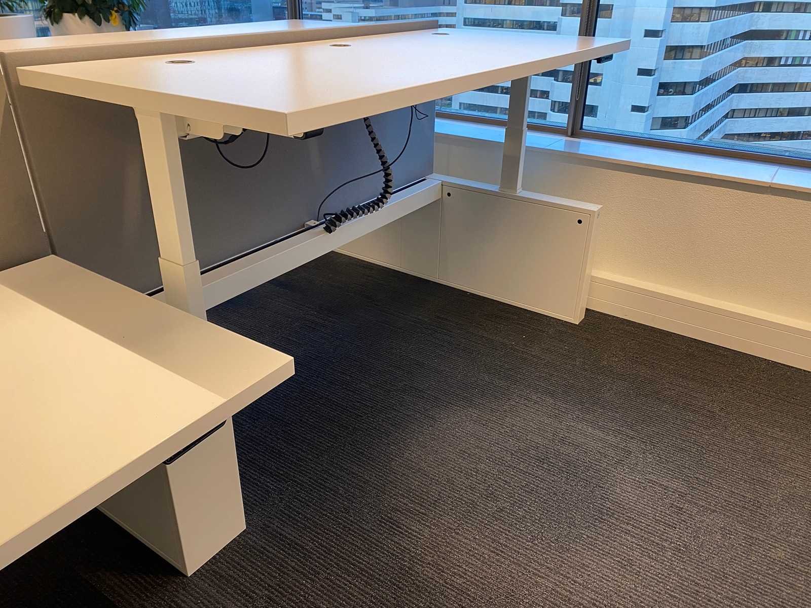 Kavel bestaande uit 1x Vepa 4p workbench en 4x WeWork bureaustoel. ----- Bureaustoel v.v. in hoogte instelbare armleggers, zithoogte instelbaar, kantelmechanisme rugleuning, netweave rugbekleding. ----- Workbench v.v. akoestische grijze scheidingswanden, kabeldoorvoer, draadgoot. Totale afmeting workbench ca. hoogte 65 tot 131 cm. - breed 360 cm. - diep 168 cm. ----- Workbench is reeds volledig professioneel gedemonteerd en onverpakt. ----- bladafmeting per bureau is ca. 180x80 cm. Nee Merk: Vepa Zit-sta: true Elektrisch verstelbaar: true