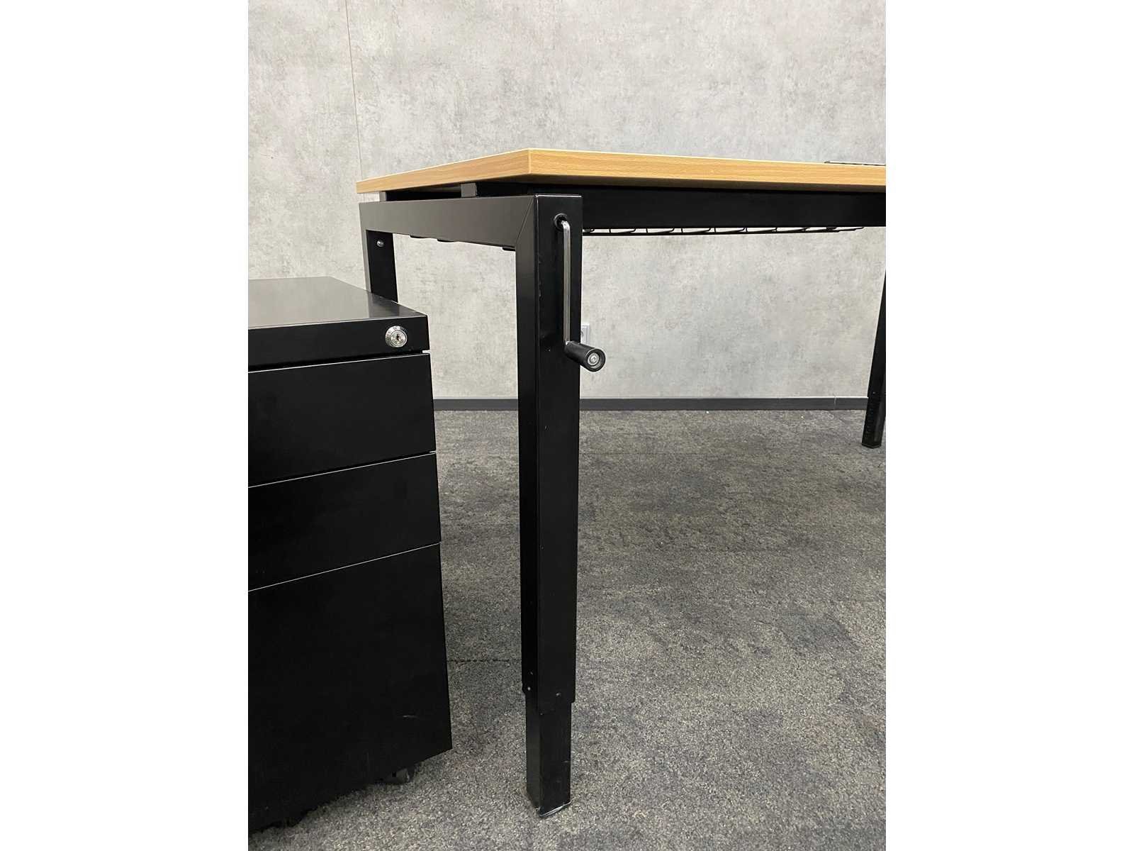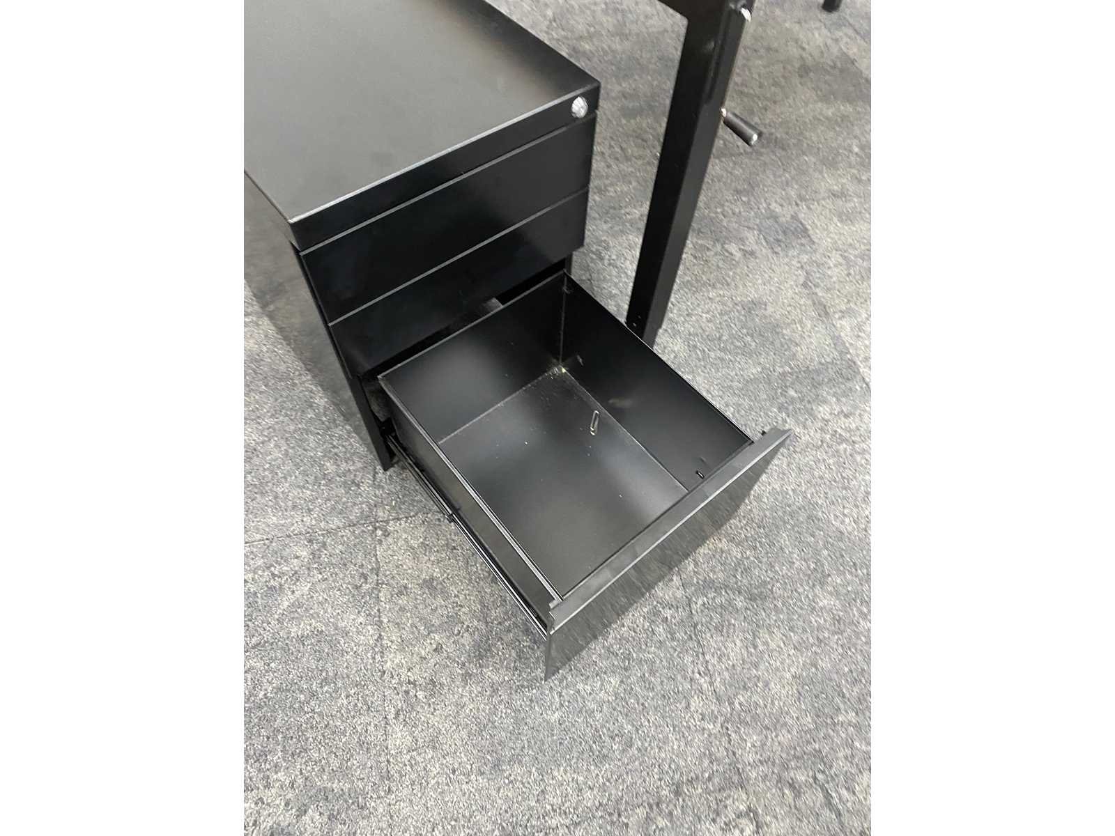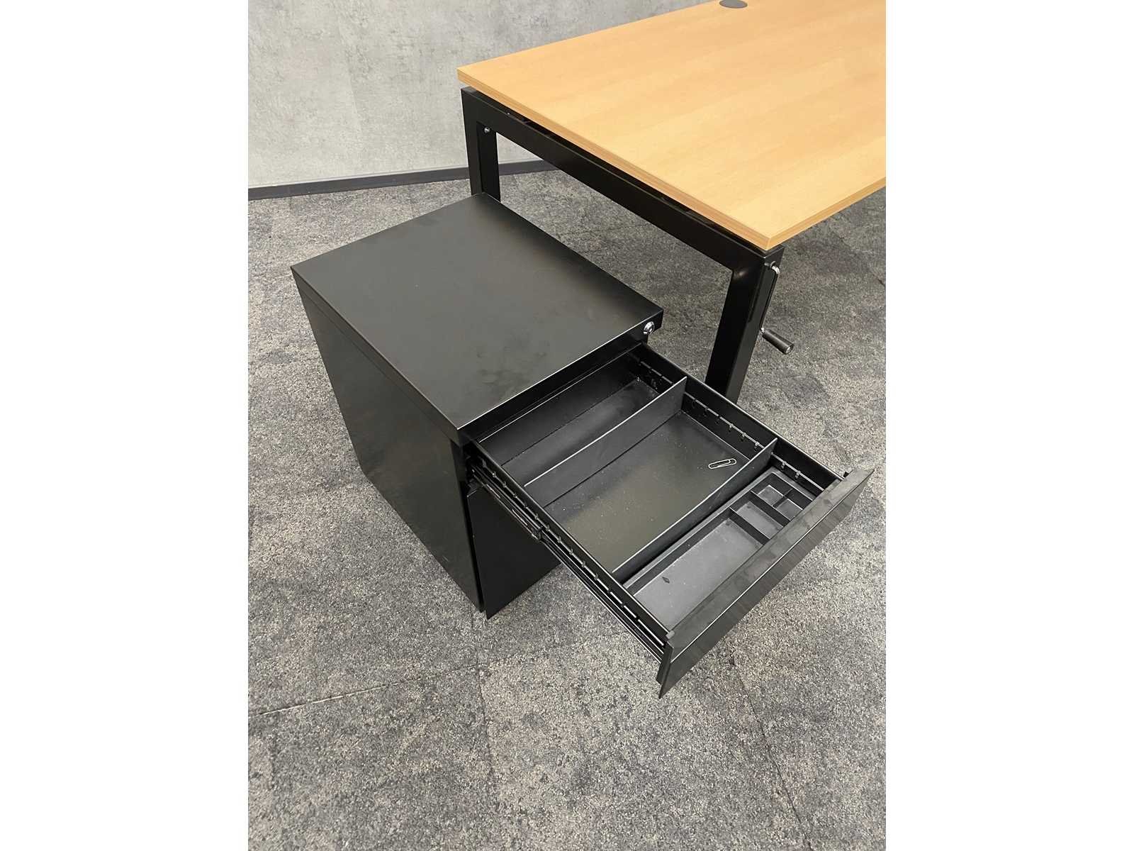 Kavel bestaande uit: 1 x slinger bureau v.v. kabeldoorvoer, draadgoot en opbouwstekkerblok --- 1 x verrijdbaar stalen ladeblok afmeting ca. h63xb41.5xd50cm zonder sleutel --- 1 x WeWork netweave bureaustoel v.v. in hoogte verstelbare armleggers, verstelbare lendesteun, zithoogte instelbaar, kantelmechanisme rugleuning Nee