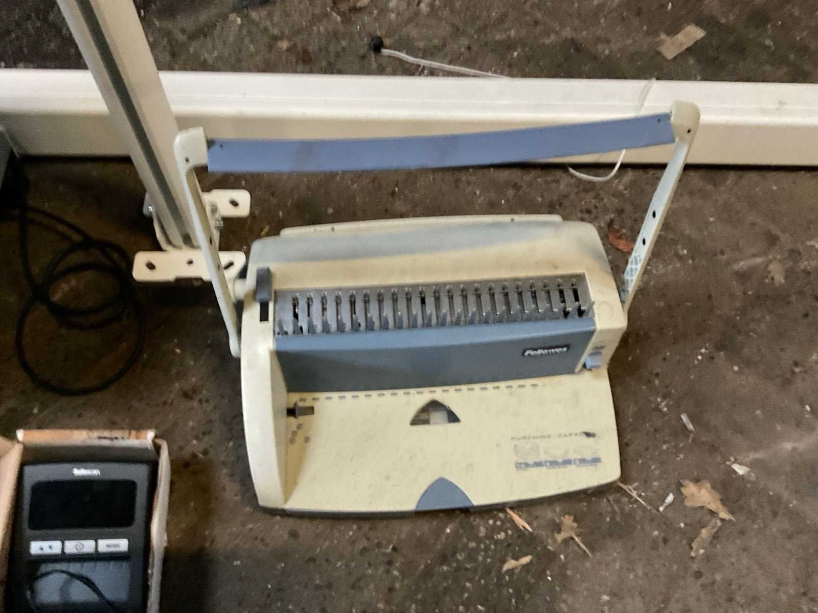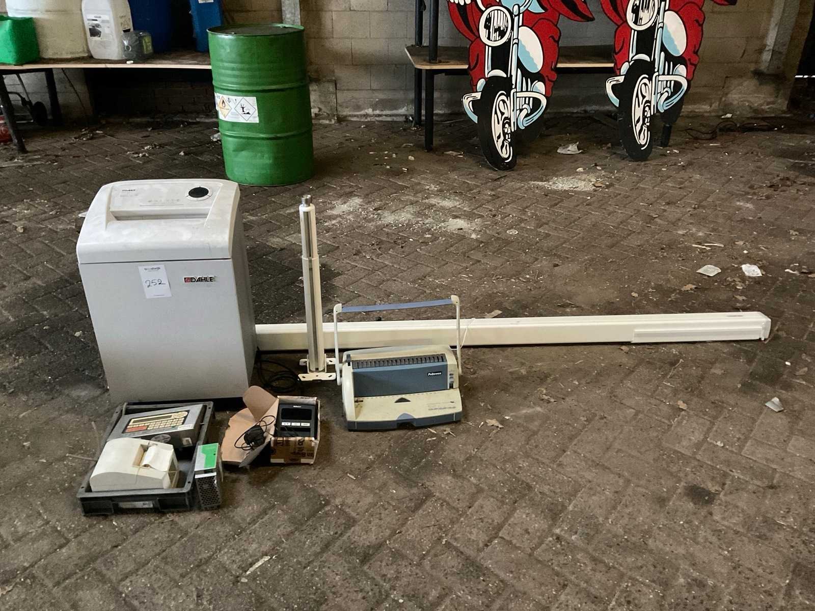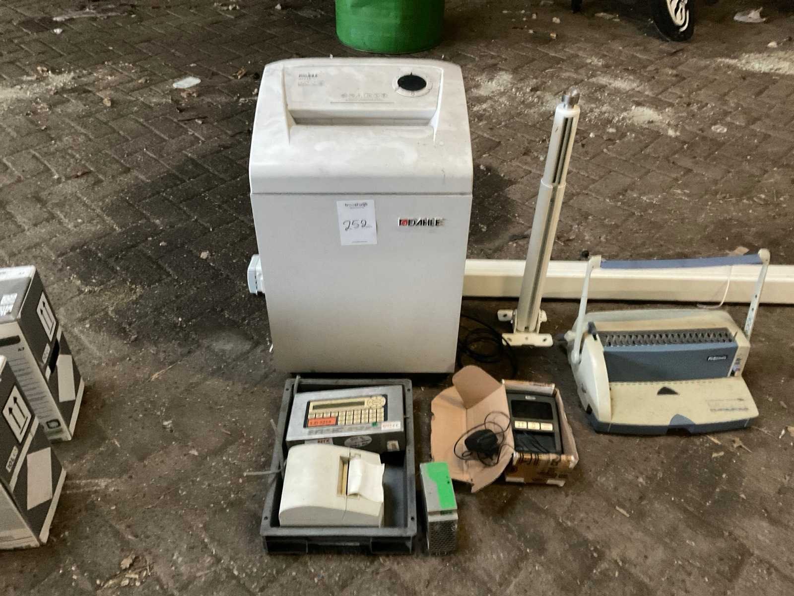 Waaronder: Dahlec papierversnipperaar, Fellowes inbindmachine, Star bonprinter, LD5218 bediengspaneel, Safescan valsgelddetector, Projecta projectiescherm, plafondbeugel voor beamer. Nee