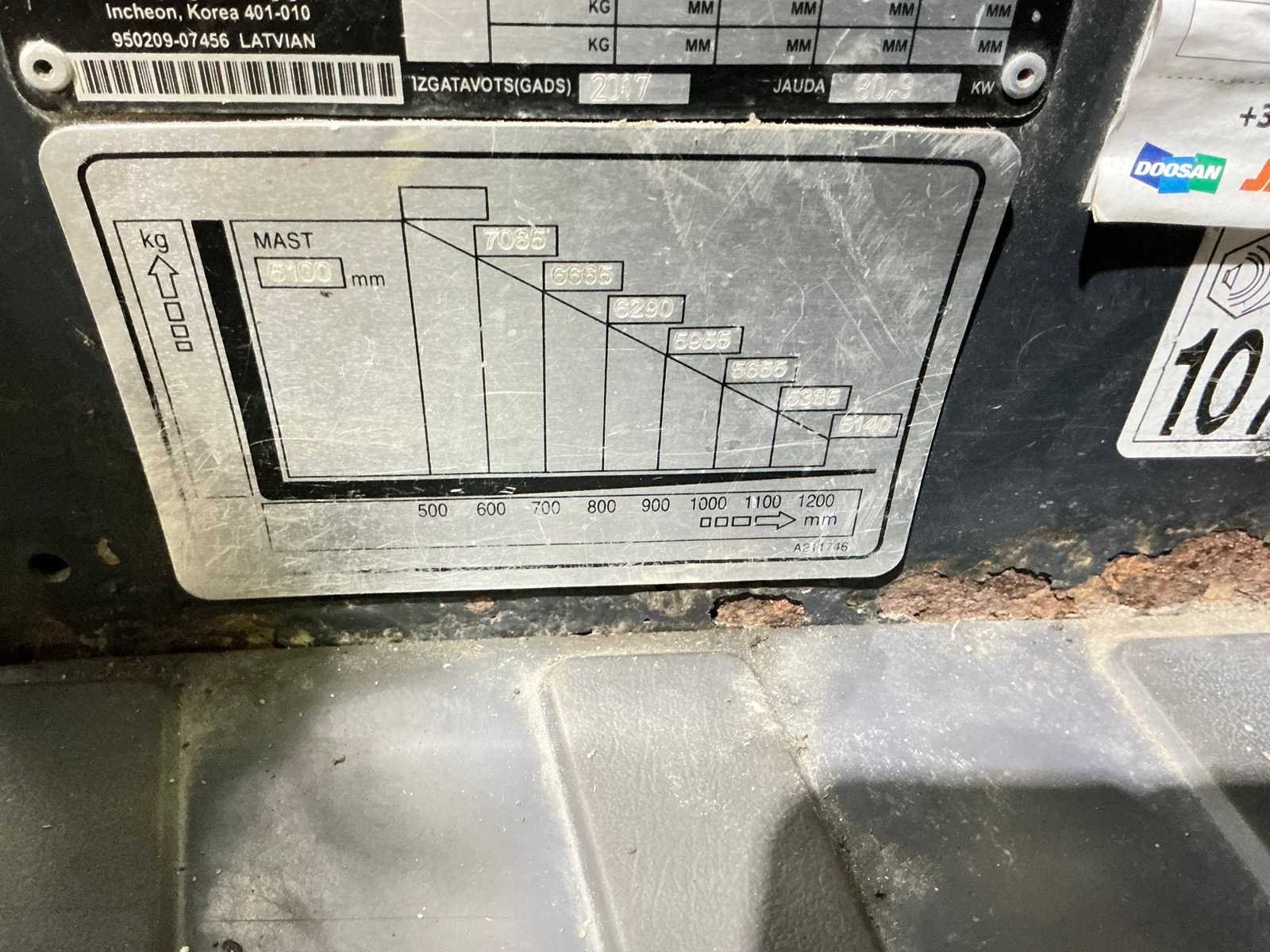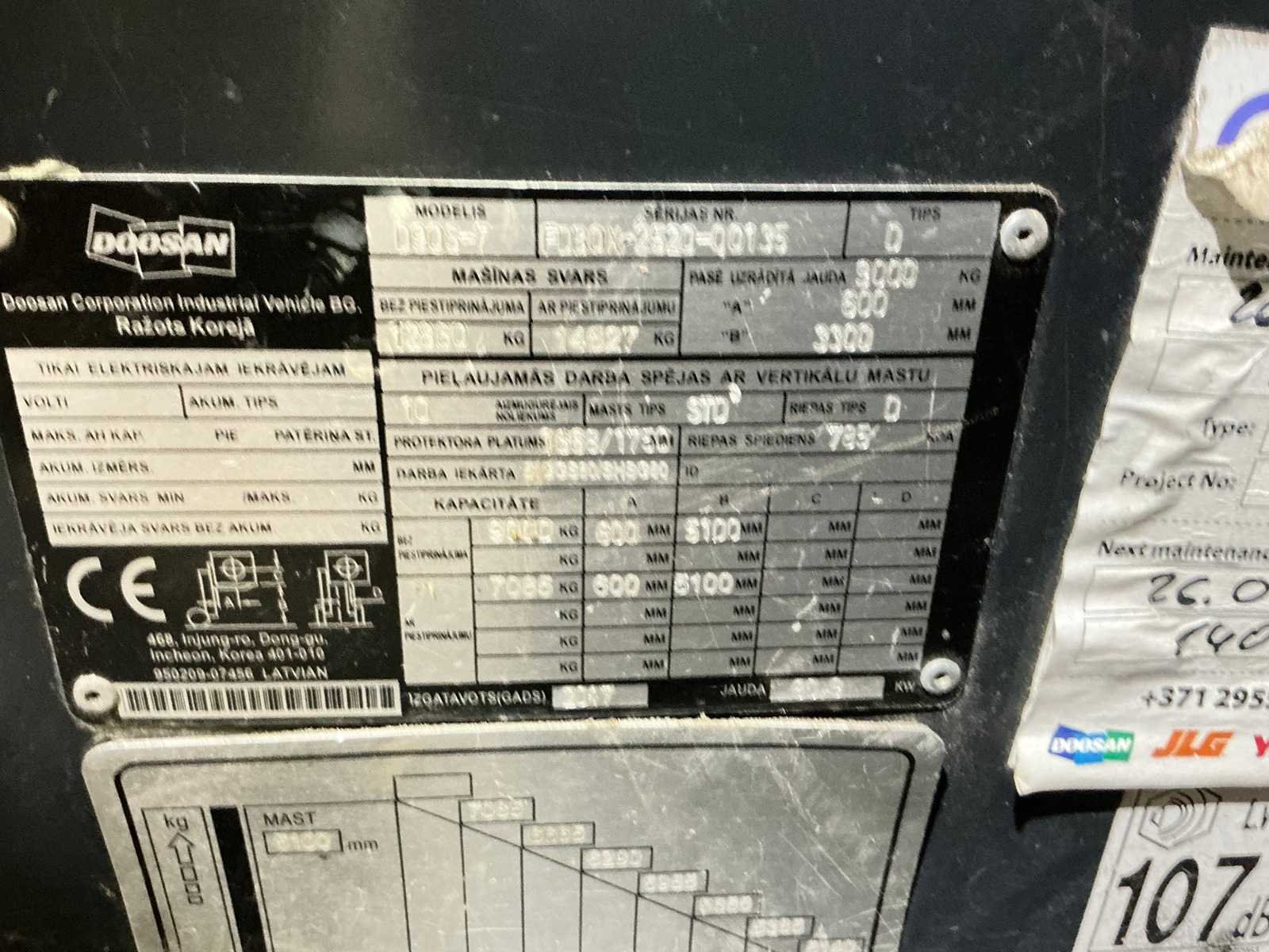 Nee Merk: Doosan Type: D90S-7 Bouwjaar: 2017 Serienummer: FDB0X-2520-00135 Brandstof: Diesel Mast: Duplex Soort band: Volrubber Aantal wielen: 6 Afgelezen urenstand: 14421 Side-shift: true Hydraulisch verstelbare lepels: true Duplex mast: true Triple mast: false Eigen gewicht: 12860kg Hefvermogen: 9000kg Lepellengte: 2440mm Hefhoogte: 5100mm Vol rubber banden: true Totale afmeting L: 4050mm Totale afmeting Breedte: 2230mm Totale afmeting Hoogte: 3950mm Diesel: true