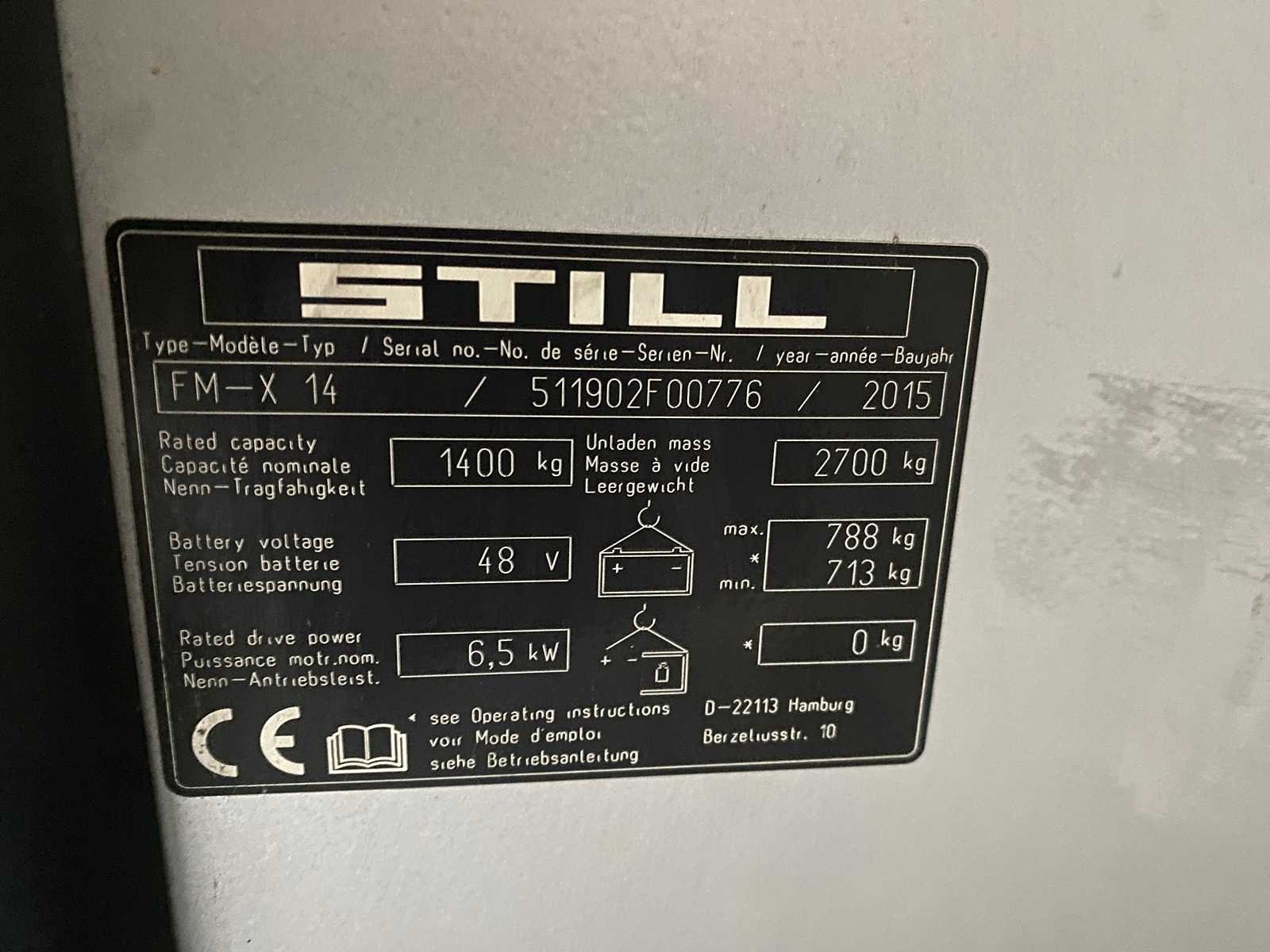 Nee Merk: Still Type: FM-X14 Bouwjaar: 2015 Serienummer: 511902F00776 Brandstof: Elektrisch Mast: Triplex Soort band: Volrubber Aantal wielen: 3 Afgelezen urenstand: 3284 Accu lader: true Free-lift: true Side-shift: true Triple mast: true Eigen gewicht: 3488kg Hefvermogen: 1400kg Lepellengte: 1150mm Hefhoogte: 7400mm Totale afmeting L: 1900mm Totale afmeting Breedte: 1270mm Totale afmeting Hoogte: 3000mm Elektrisch: true Vol rubber banden: true