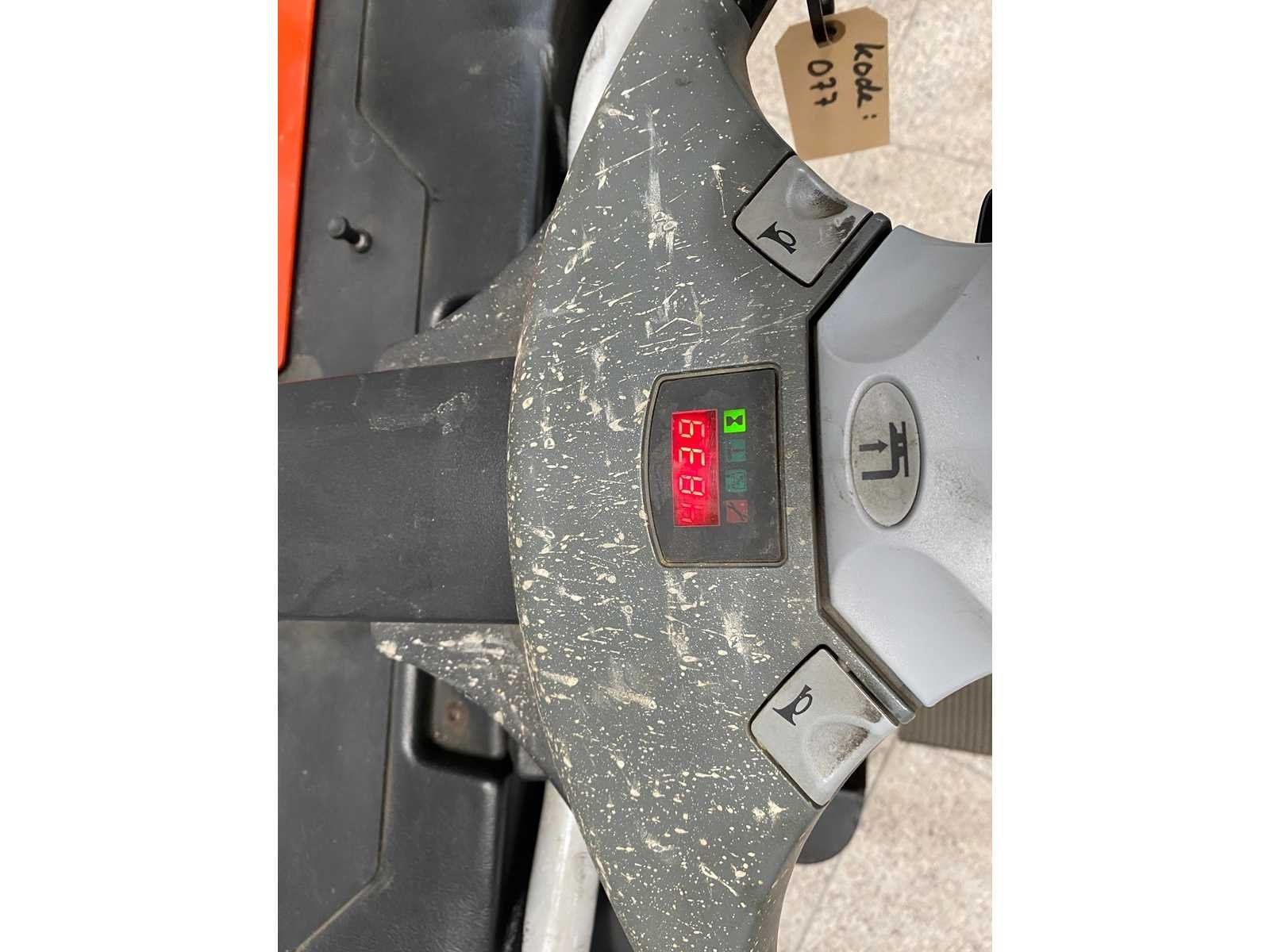 No Merk: BT Type: LPE240 Bouwjaar: 2006 Serienummer: 936848 Hefvermogen: 2400kg Lepellengte: 1150mm Meerij palletwagen: true Accu lader: true Afgelezen urenstand: 4838 Eigen gewicht: 1065kg Totale afmeting L: 2150mm Totale afmeting Breedte: 800mm Totale afmeting Hoogte: 1500mm