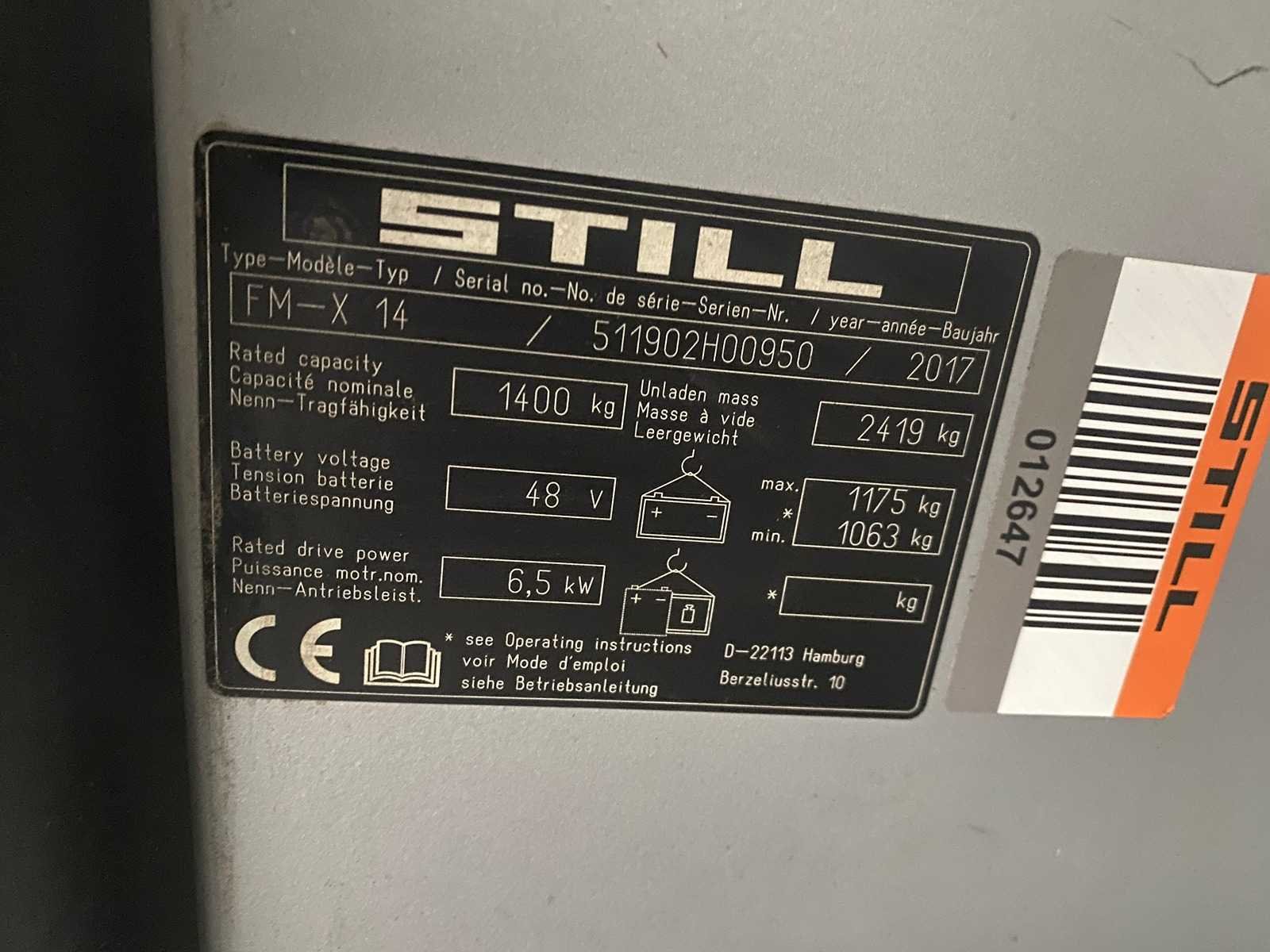 Bouwjaar batterij 2022 Nee Merk: Still Type: FM-X14 Bouwjaar: 2017 Serienummer: 511902H00950 Brandstof: Elektrisch Mast: Triplex mast Soort band: Volrubber Aantal wielen: 3 Afgelezen urenstand: 6882 Accu lader: true Free-lift: true Side-shift: true Triple mast: true Eigen gewicht: 3594kg Hefvermogen: 1400kg Lepellengte: 1150mm Hefhoogte: 5000mm Totale afmeting L: 1900mm Totale afmeting Breedte: 1270mm Totale afmeting Hoogte: 2200mm Elektrisch: true Vol rubber banden: true
