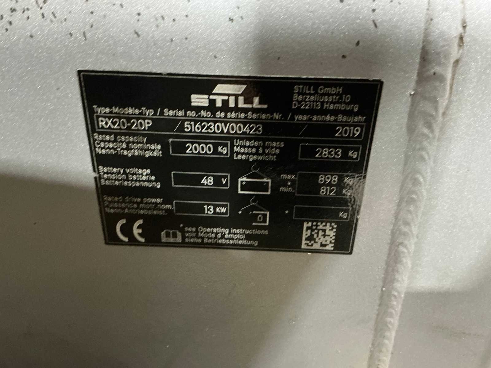 Nee Merk: Still Type: RX20-20P Bouwjaar: 2019 Serienummer: 516230V00423 Brandstof: Elektrisch Mast: Triplex Soort band: Volrubber Aantal wielen: 4 Afgelezen urenstand: 21067 Accu lader: true Free-lift: true Side-shift: true Triple mast: true Eigen gewicht: 3731kg Hefvermogen: 2000kg Lepellengte: 1200mm Hefhoogte: 5100mm Vol rubber banden: true Totale afmeting L: 2050mm Totale afmeting Breedte: 1150mm Totale afmeting Hoogte: 2250mm