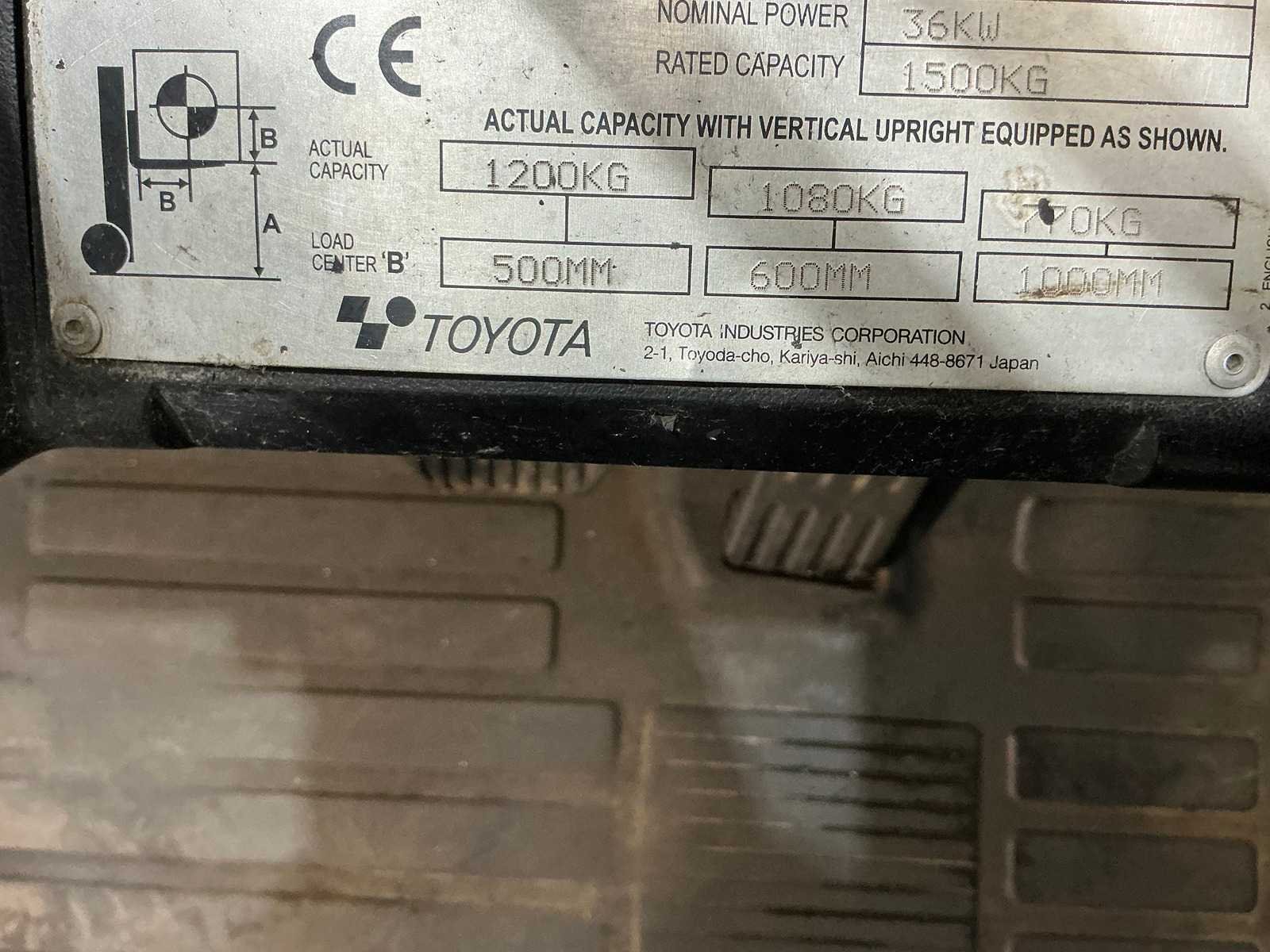 Nee Merk: Toyota Type: 02-7 FDF 15 Bouwjaar: 2017 Serienummer: 8FDF18E61452 Brandstof: Diesel Mast: Duplex Soort band: Volrubber Aantal wielen: 4 Afgelezen urenstand: 8330 Accu lader: false Side-shift: true Duplex mast: true Triple mast: false Eigen gewicht: 2850kg Hefvermogen: 1500kg Lepellengte: 1150mm Hefhoogte: 4500mm Vol rubber banden: true Totale afmeting L: 2150mm Totale afmeting Breedte: 1050mm Totale afmeting Hoogte: 2830mm Diesel: true