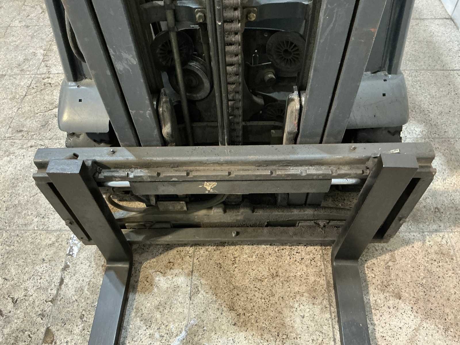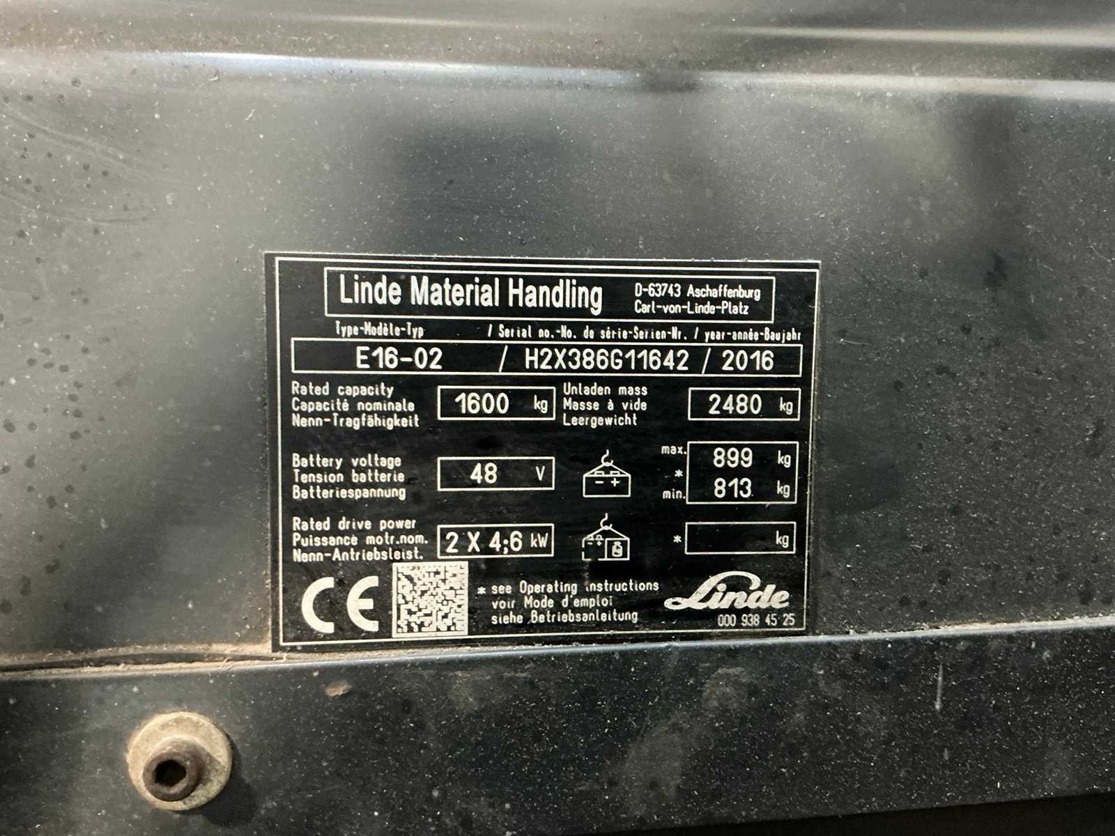 Nee Merk: Linde Type: E16-02 Bouwjaar: 2016 Serienummer: H2X386G11642 Brandstof: Elektrisch Mast: Triplex Soort band: Volrubber Aantal wielen: 3 Afgelezen urenstand: 6114 Accu lader: true Free-lift: true Side-shift: true Duplex mast: false Triple mast: true Eigen gewicht: 3379kg Hefvermogen: 1600kg Lepellengte: 1100mm Hefhoogte: 1450mm Vol rubber banden: true Totale afmeting L: 1900mm Totale afmeting Breedte: 1100mm Totale afmeting Hoogte: 1960mm