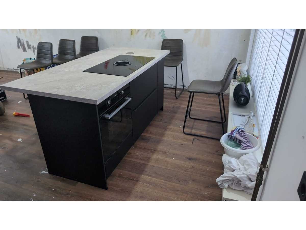Conditie gebruikt; ingepakt op 2 Pallets; zonder koelkast en barkrukken; afmetingen eiland lxb ca. 205x100 cm; afmetingen linkerdeel lxb ca. 152x60 cm; afmetingen rechterdeel lxb ca. 152x60 cm; reeds gedemonteerd en ingepakt op pallets. (afstapelen, omruilen of statiegeld per pallet); pallets zijn niet inbegrepen; statiegeld betalen bij afhalen, of pallets afstapelen; werkblad niet ingepakt op pallets Nee Type keukenopstelling: Eiland + hoek Aanrechtblad: Hout grijs Fornuis: Exquisit Softclose: true Oven: Exquisit Vaatwasser: Inventum Hoofdkleur: Zwart