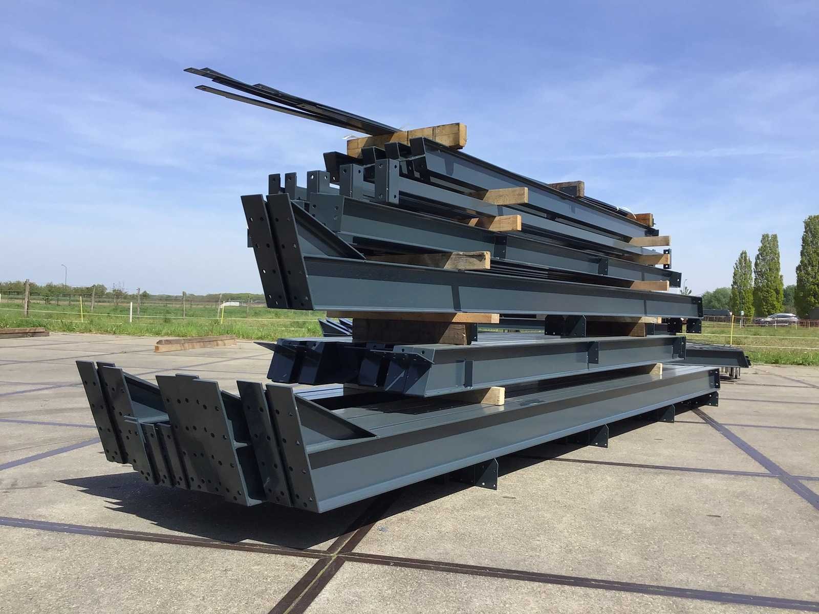 Dakhelling 20 graden: Constructie bestaat uit: 5 tussenspanten: 2x kolom I220 en 2x dakligger I220 1 eindspant: 2x hoekkolom I160: 2x dakligger I140 en 2x tussenkolom I160 1 eindspant: 2x hoekkolom I160: 2x dakligger I140: 2x tussenkolom U160 1x deurbalk U160 à 4 meter 5 koppelbuizen 70x70x3 mm 12 windverbandstrippen plat 50x6 mm met spanner M16 Gepoedercoat RAL7016 Schroeven 8.8 Inclusief NEN 1090 CE Markering Certificaat Kavel wordt met een heftruck gratis geladen No Materiaal: staal gepoedercoat Bouwjaar: 2026 Goot hoogte: 4300.00mm Nok hoogte: 6411.00mm Totale afmeting L: 30000mm Totale afmeting Breedte: 11600mm