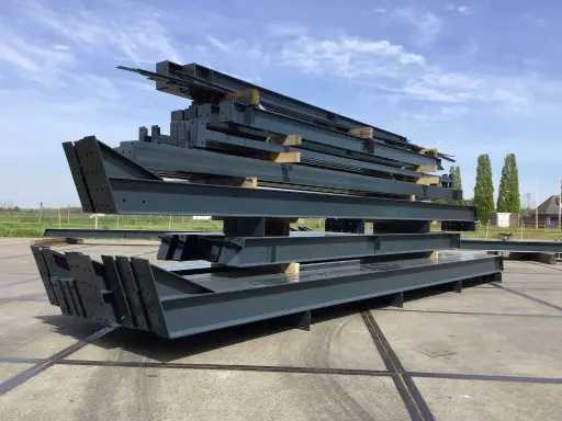 Dakhelling 20 graden Constructie bestaat uit: 7 tussenspanten: 2x kolom I220 en 2x dakligger I220 1 eindspant: 2x hoekkolom I160: 2x dakligger I140 en 2x tussenkolom I160 1 eindspant: 2x hoekkolom I160: 2x dakligger I140: 2x tussenkolom U160 en 1x deurbalk U160 à 4 meter 5 koppelbuizen 70x70x3 mm 12 windverbandstrippen plat 50x6 mm met spanner M16 Gepoedercoat RAL7016 Schroeven 8.8 Inclusief NEN 1090 CE Markering Certificaat Kavel wordt met een heftruck gratis geladen No Materiaal: staal gepoedercoat Bouwjaar: 2026 Goot hoogte: 4300.00mm Nok hoogte: 6411.00mm Totale afmeting L: 40000mm Totale afmeting Breedte: 11600mm