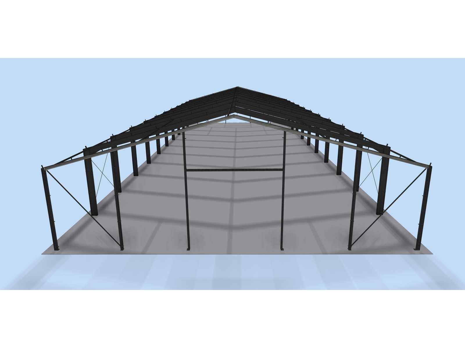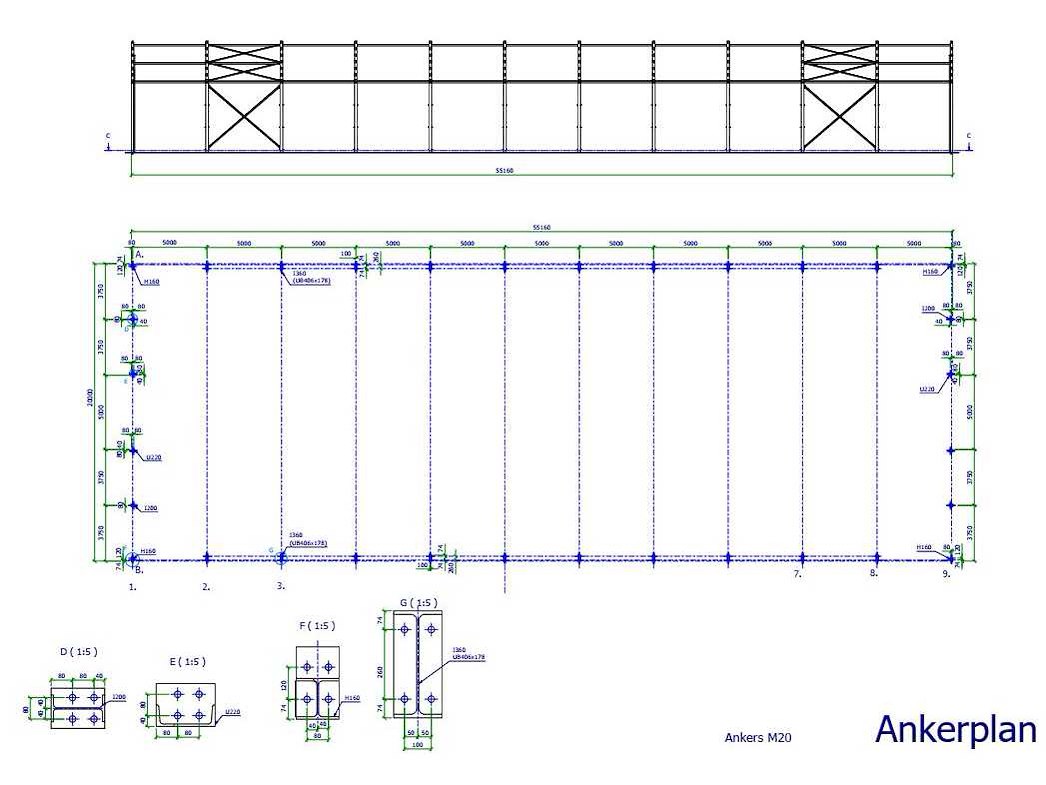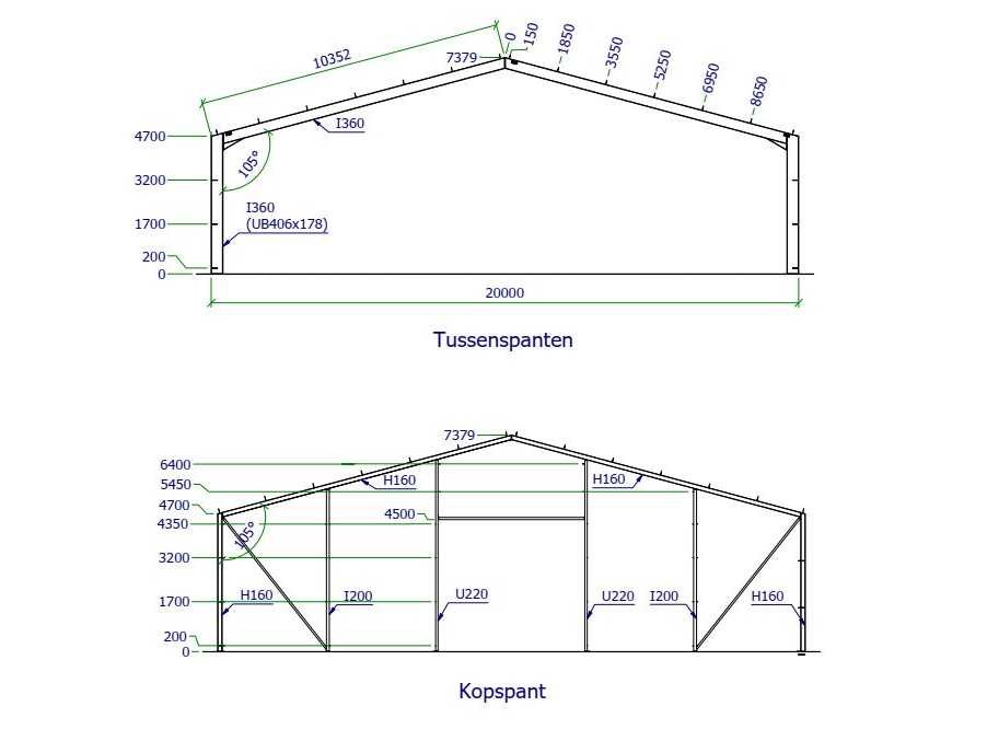 Dakhelling 15 graden Constructie bestaat uit: 10 Tussenspanten: 2 x kolom UB406 x 178 (I360), 2x dakligger I360 2 Eindspanten: 2 x hoekkolom H160, 2 x dakligger H160, 2 x tussenkolom I200, 2 x tussenkolom U220 en 1 x deurbalk U220 á 5,00mtr. 10 Koppelbuizen 80 x 80 x 4 mm 31 Koppelbuizen 70 x 70 x 3 mm 28 Windverband rond 20 met spanner M20 Gepoedercoat RAL7016 Schroeven 8.8 Met NEN 1090 CE Markering Certificaat Kavel wordt met een heftruck gratis geladen Nee Materiaal: staal gepoedercoat Bouwjaar: 2026 Goot hoogte: 4700mm Nok hoogte: 7379mm Totale afmeting L: 55000mm Totale afmeting Breedte: 20000mm