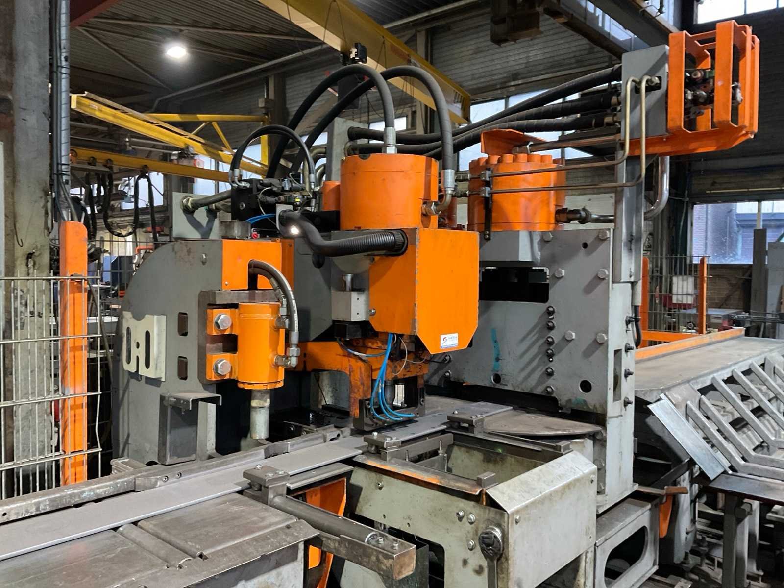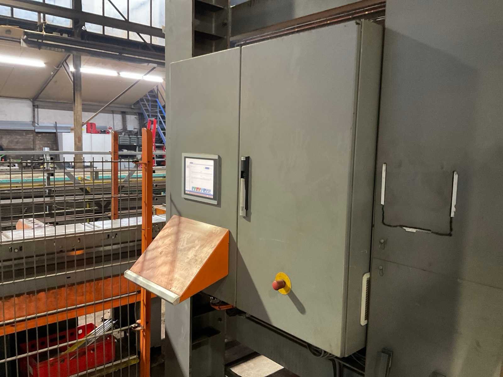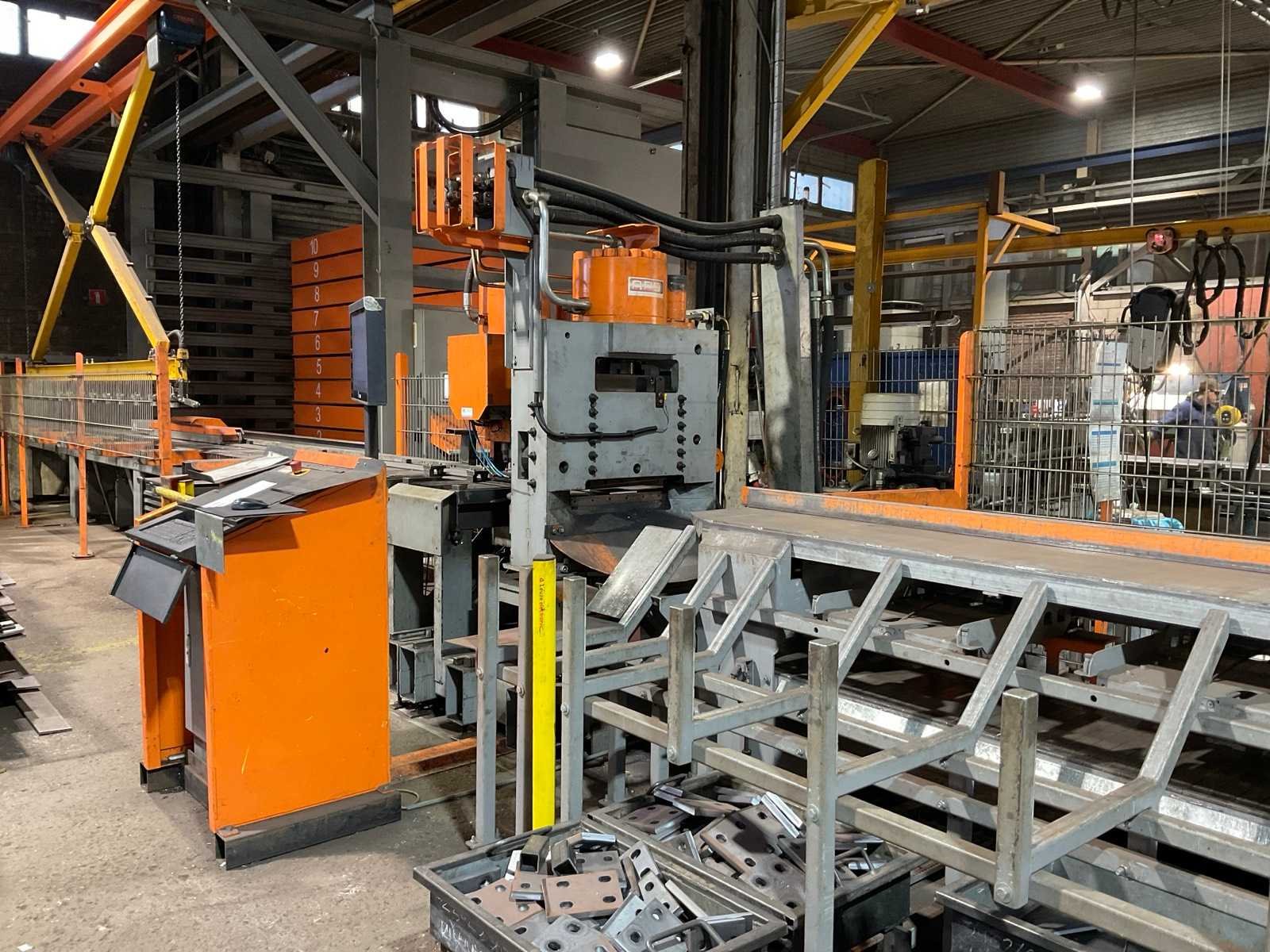 Bestaande uit; (1x) CNC pons- en knipmachine; v.v. automatische 3-voudige ponsunit; max. cap. 110 ton; min. - max. pons Ø 5 - 50 mm; max. materiaaldikte 32 mm; incl. diverse ponstoebehoren; (1x) vlakstaal strippen magazijn; type RFS 11; v.v. 11 laden; lade afmeting 6200x1500 mm; hoogte 170 mm; cap. vlak profiel minimaal 50 x 6 mm; maximaal 500 x 25 mm; maximaal gewicht per lade 10.000 kg; automatisch aanvullend; totale afmeting strippen magazijn 7000x5660x4500 mm; (1x) bovenloopkraan; maximaal hijsvermogen 800 kg; v.v. hijsbalk; (2x) “DEMAG” kettingtakel en (12x) hijsmagneten; (1x) sorteer uitvoer systeem; type RS3-6; v.v. 3 uitwerpstations; dwarsafwerper; materiaaldetectie; kettingtapijt; schakelkasten en hydraulische aggregaat; handboek aanwezig Nee Merk: APS Europe Type: RP-503 Bouwjaar: 2016 Serienummer: 2017.12.17113 Ponskracht: 1078kN Digitale uitlezing: true Aansluiting: 400V Afmeting l: 20000mm Afmeting b: 8000mm Afmeting h: 4500mm