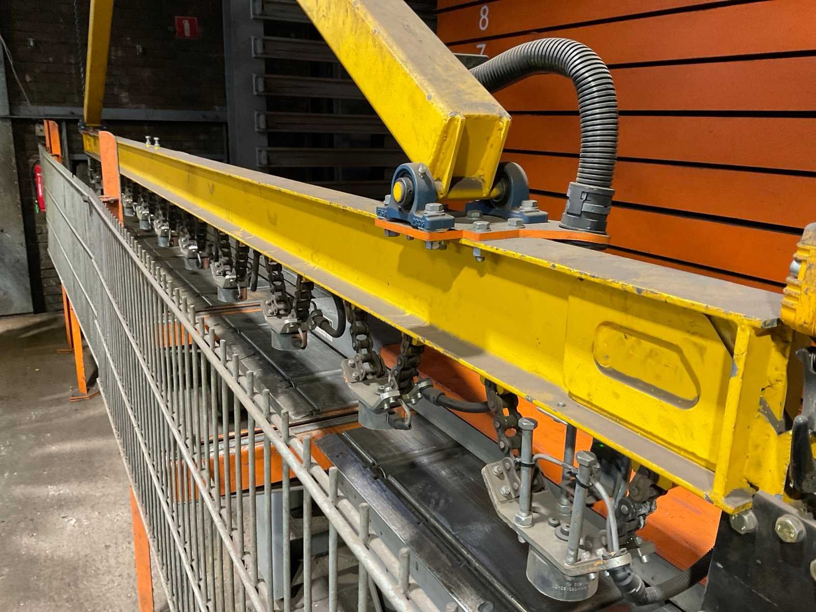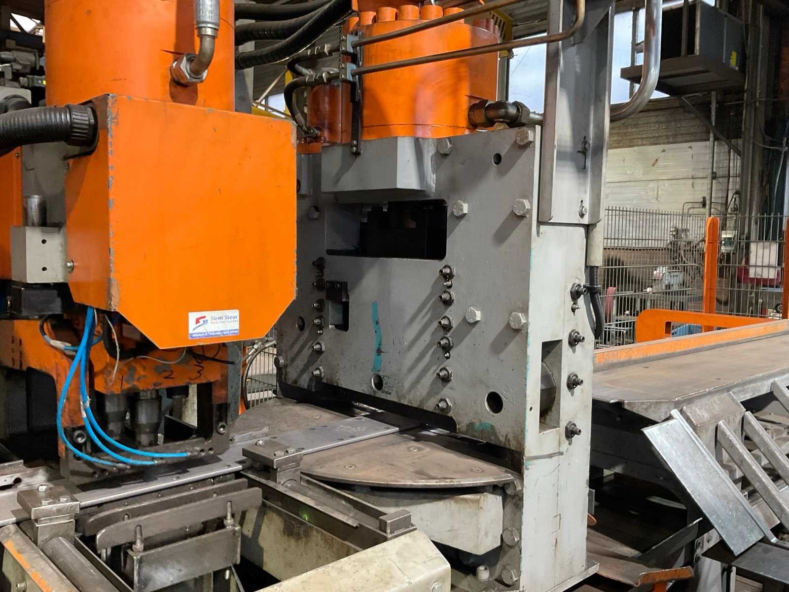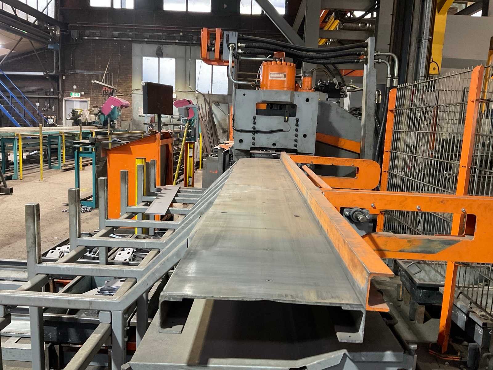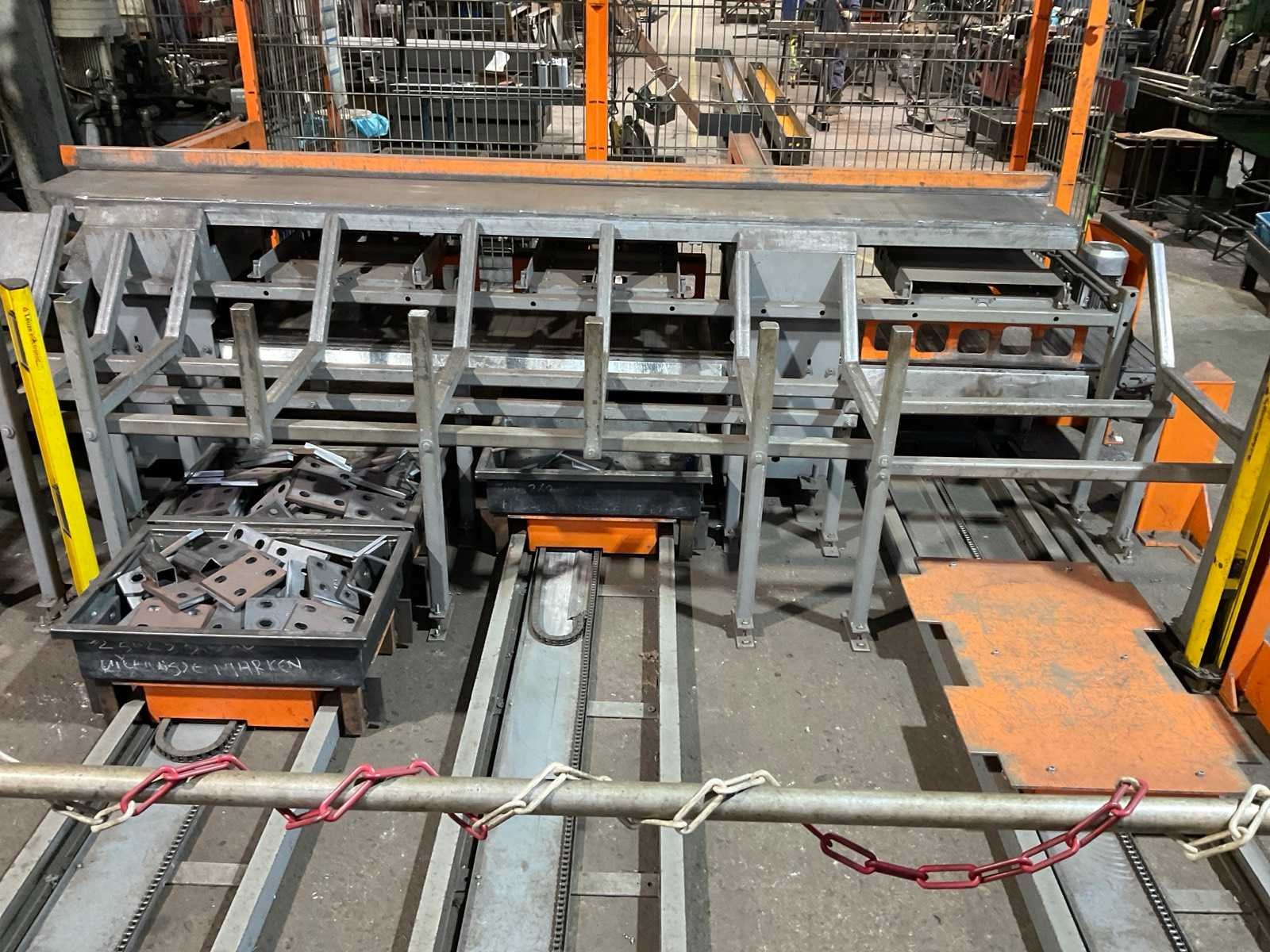 Bestaande uit; (1x) CNC pons- en knipmachine; v.v. automatische 3-voudige ponsunit; max. cap. 110 ton; min. - max. pons Ø 5 - 50 mm; max. materiaaldikte 32 mm; incl. diverse ponstoebehoren; (1x) vlakstaal strippen magazijn; type RFS 11; v.v. 11 laden; lade afmeting 6200x1500 mm; hoogte 170 mm; cap. vlak profiel minimaal 50 x 6 mm; maximaal 500 x 25 mm; maximaal gewicht per lade 10.000 kg; automatisch aanvullend; totale afmeting strippen magazijn 7000x5660x4500 mm; (1x) bovenloopkraan; maximaal hijsvermogen 800 kg; v.v. hijsbalk; (2x) “DEMAG” kettingtakel en (12x) hijsmagneten; (1x) sorteer uitvoer systeem; type RS3-6; v.v. 3 uitwerpstations; dwarsafwerper; materiaaldetectie; kettingtapijt; schakelkasten en hydraulische aggregaat; handboek aanwezig Nee Merk: APS Europe Type: RP-503 Bouwjaar: 2016 Serienummer: 2017.12.17113 Ponskracht: 1078kN Digitale uitlezing: true Aansluiting: 400V Afmeting l: 20000mm Afmeting b: 8000mm Afmeting h: 4500mm