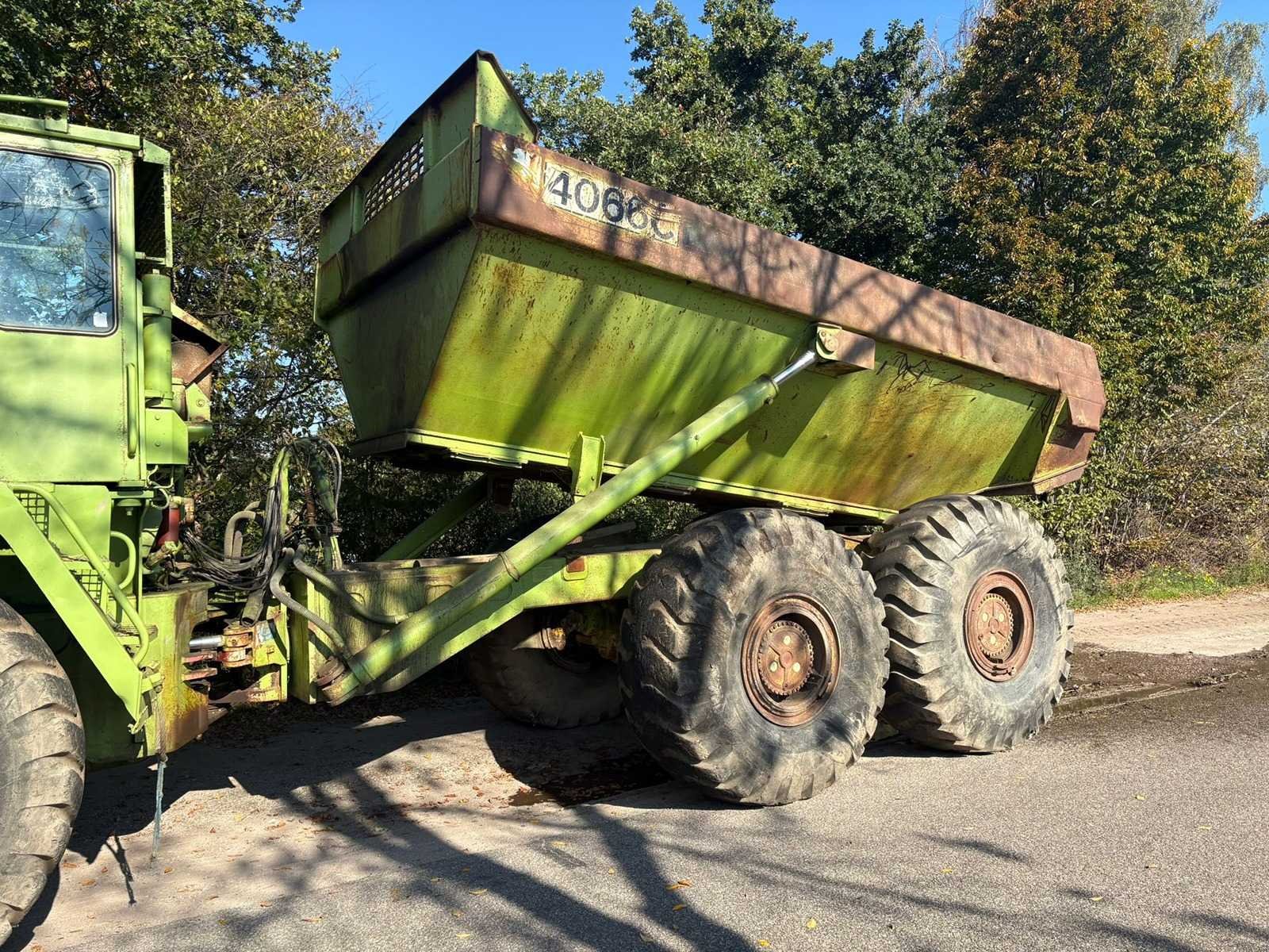 Voorzien van: motorfabrikant Detroit Diesel Serie 60, motorvermogen 298 kW, 6-traps automatische transmissie, hydrostatisch stuurbekrachtigingssysteem.6-traps automatische transmissie, geen remmen, aandrijf as mist totale hoogte 4m, totale lengte 11m, totale breedte 3m, wielbasis 6m, inhoud laadbak 22 m³, rijsnelheid 45 km/u, netto laadvermogen 36,5t, draaicirkel buiten 19,5 m. Nee Merk: Terex Type: 4066c Serienummer: A5291020 Bouwjaar: 1995 Merk motor: Detroit Motorvermogen (kW): 298kW Aantal cilinders: 6 Brandstof: Diesel Bedrijfsgewicht: 36500kg Cabine: true Eigen gewicht: 28700kg Totale afmeting L: 10000mm Totale afmeting Breedte: 3300mm Totale afmeting Hoogte: 3550mm