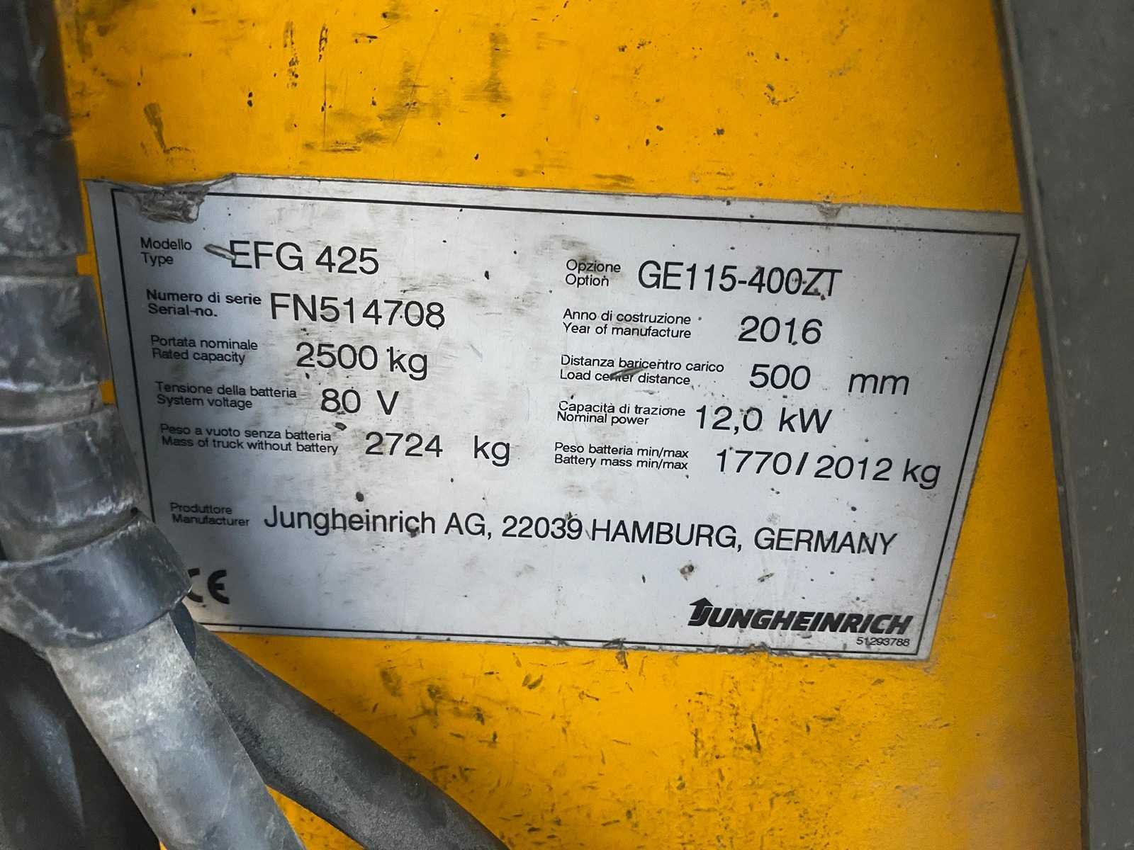 Bezichtiging Nee Merk: Jungheinrich Type: EFG425K Bouwjaar: 2016 Serienummer: FN514708 Brandstof: Elektrisch Mast: Duplex Aantal wielen: 4 Afgelezen urenstand: 5447 Accu lader: true Side-shift: true Duplex mast: true Eigen gewicht: 4555kg Hefvermogen: 2500kg Lepellengte: 1200mm Hefhoogte: 4120mm Vol rubber banden: true Totale afmeting L: 2500mm Totale afmeting Breedte: 1200mm Totale afmeting Hoogte: 2650mm