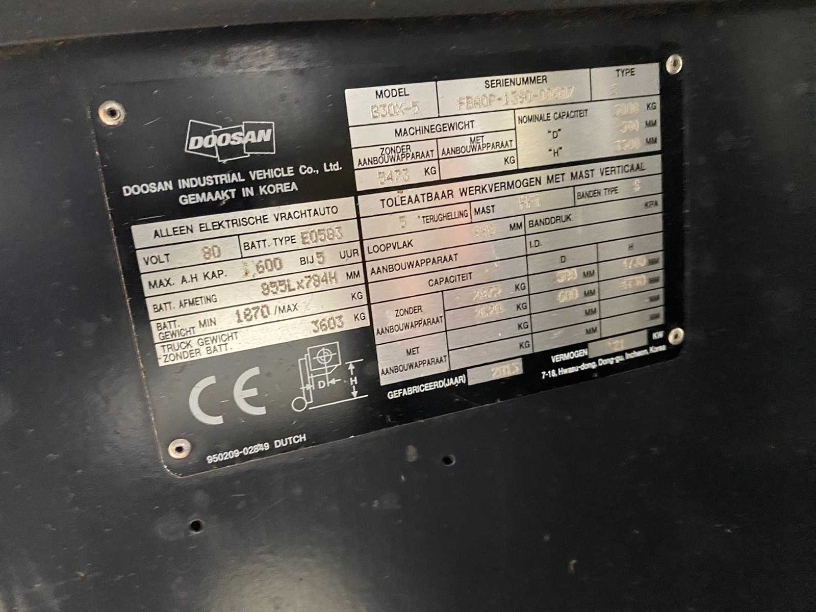 Accu van 2016 Bezichtiging op afspraak! Nee Merk: Doosan Type: B30X-5 Bouwjaar: 2013 Brandstof: Elektrisch Aantal wielen: 3 Free-lift: true Side-shift: true Triple mast: true Eigen gewicht: 5000kg Hefvermogen: 3000kg Lepellengte: 1200mm Hefhoogte: 4730mm Totale afmeting L: 2500mm Totale afmeting Breedte: 1200mm Totale afmeting Hoogte: 2220mm