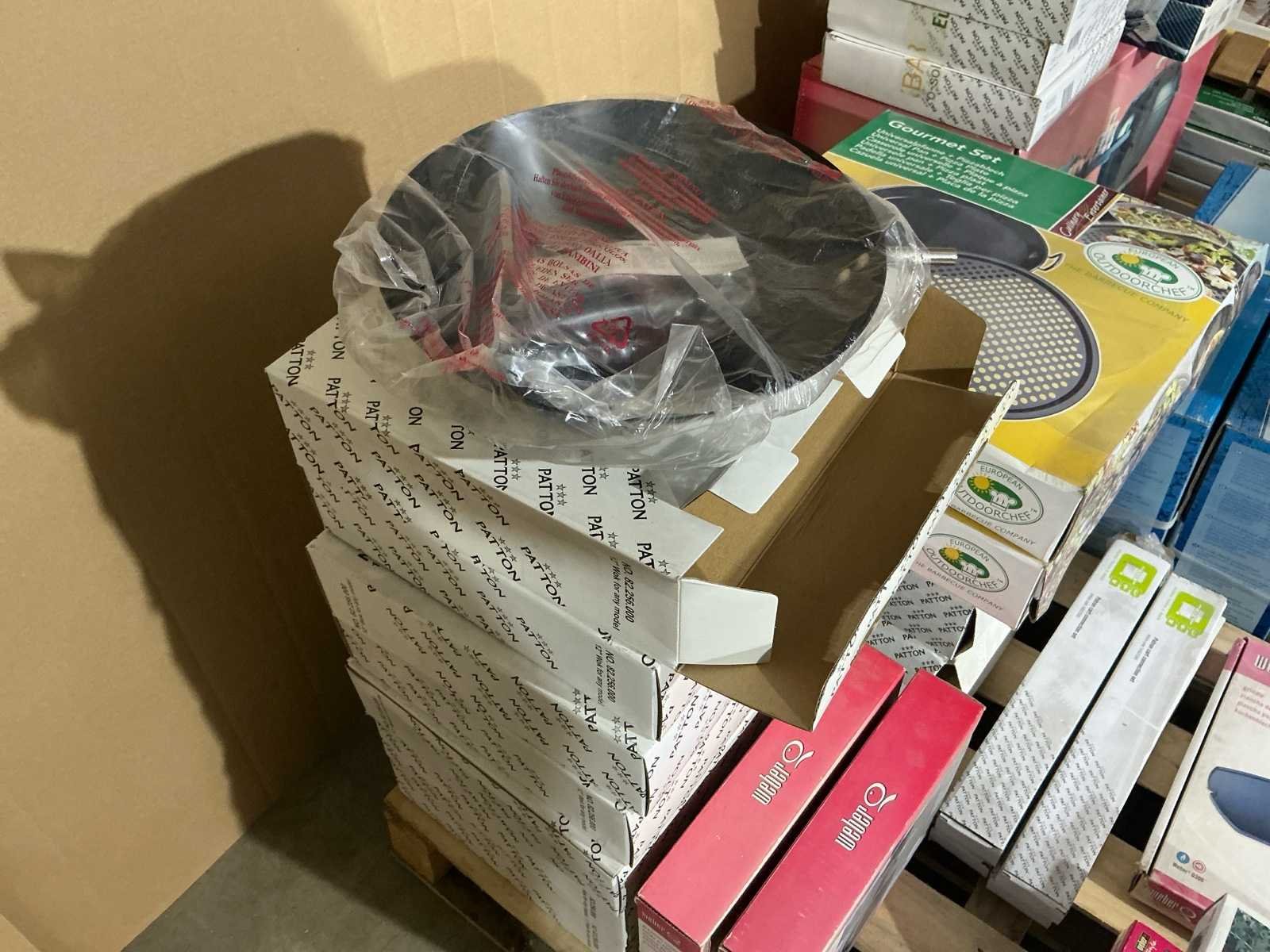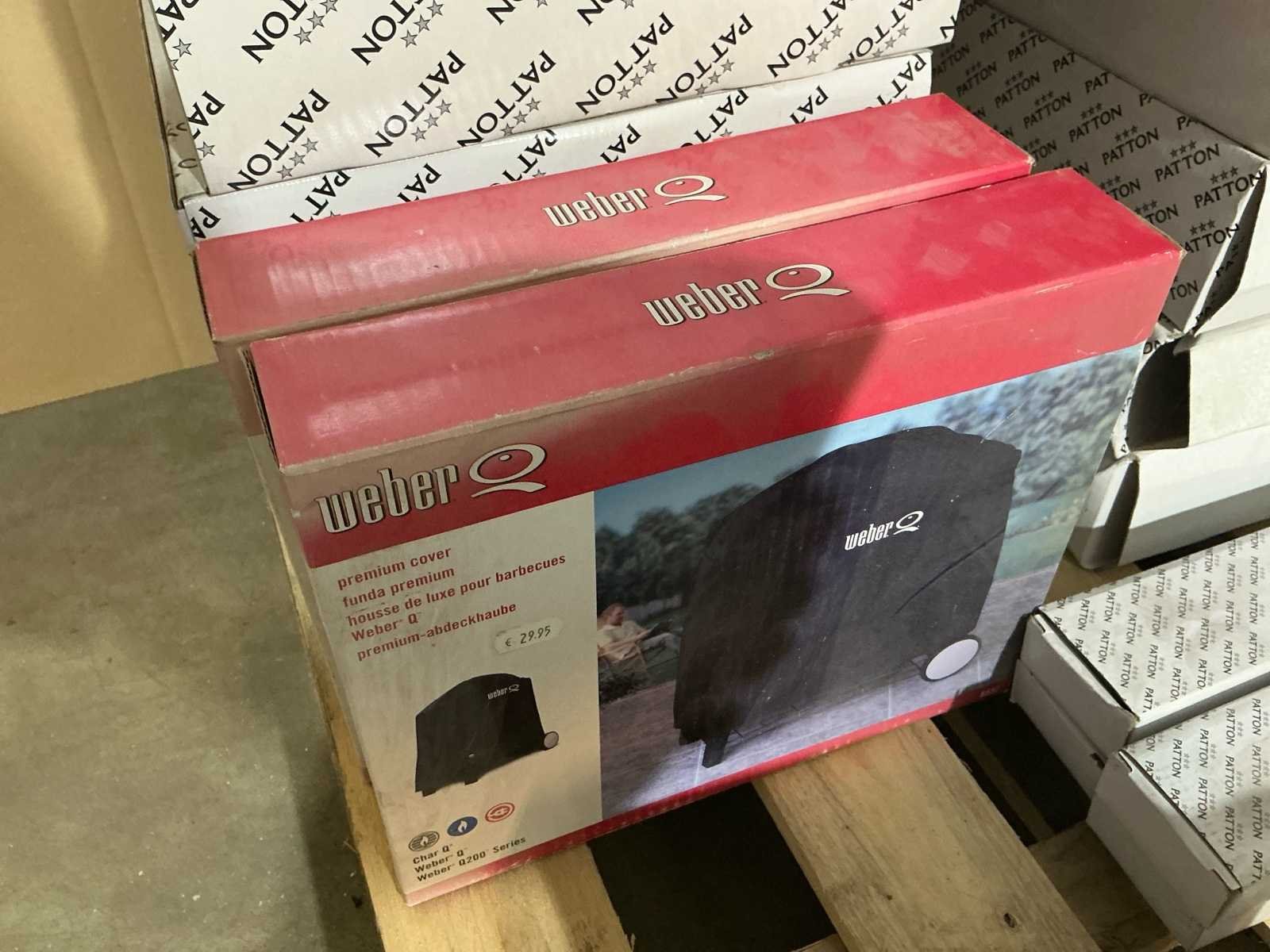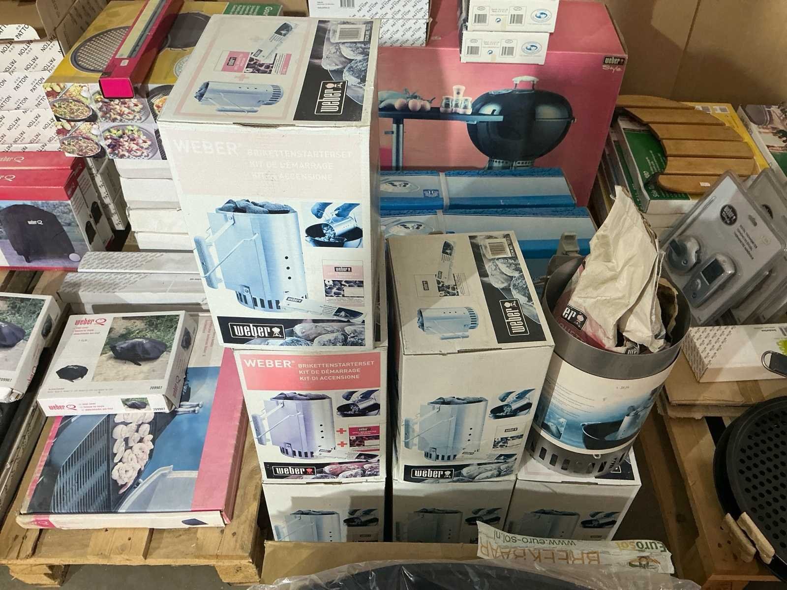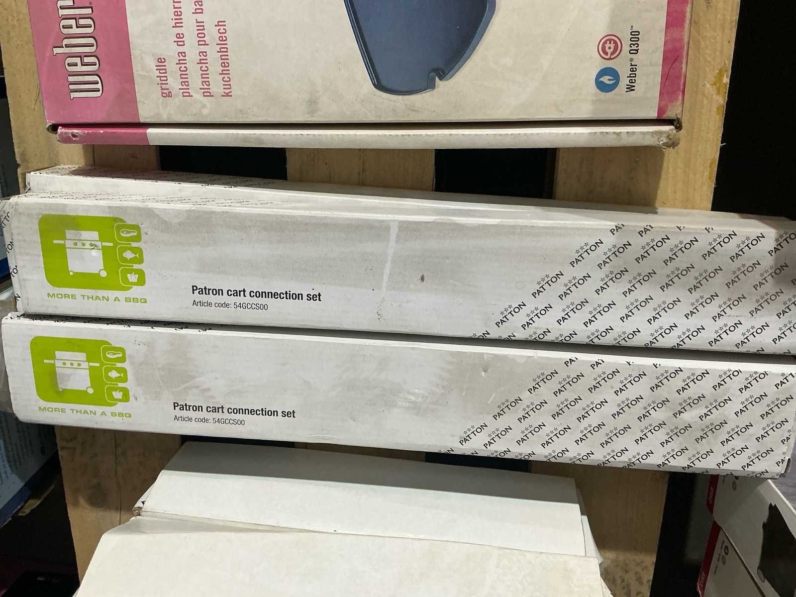 Bestaat uit: 3 pallets met barbecue benodigdheden, Weber briketten starter 7 stuks, Weber vinyl cover 4 stuks, Weber magneet messenhiuder, 2x gourmetset, Patton wok7 stuks, Patton connectie set 4x, Patton borstels, BBQ tangen, Patton spatel 6x, 9 side table, BBQ short 2x, kist aanmaak blokjes, recepten boeken, Patton fish-grill,Weber digitale thermometer, 2 stuks wok set, Weber BBQ, BBQ handschoenen, Nee Merk: Weber Model: Diversen