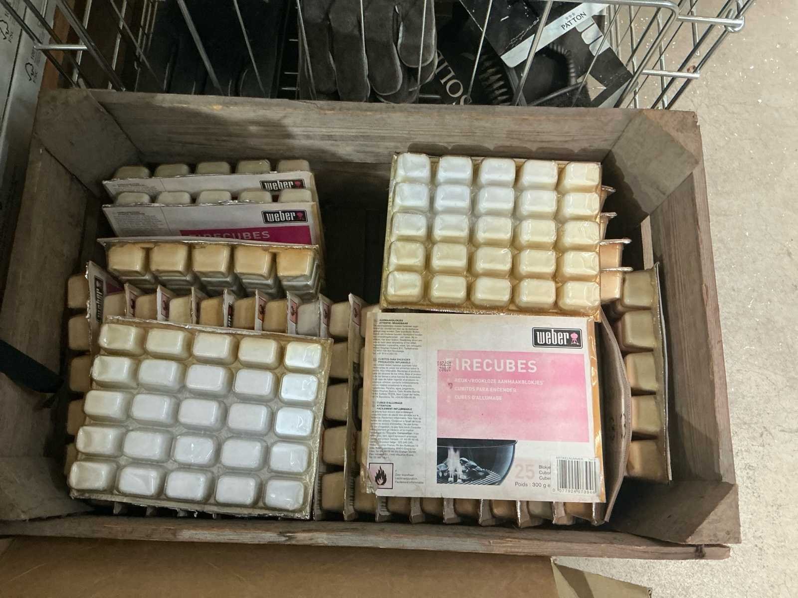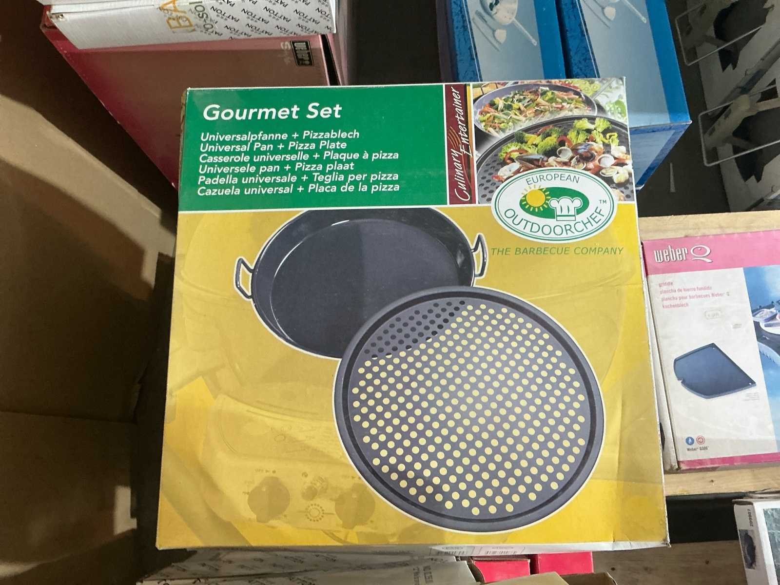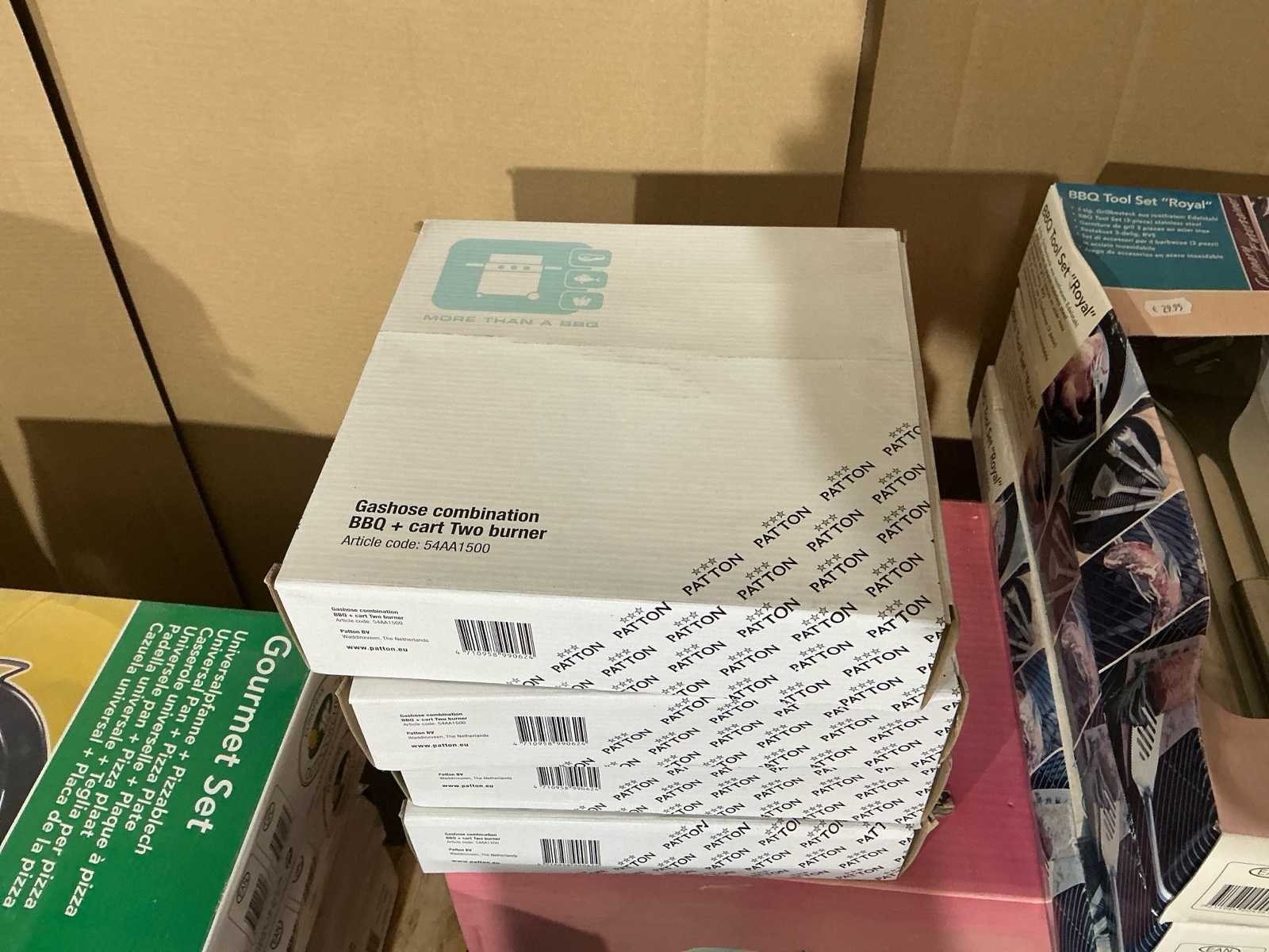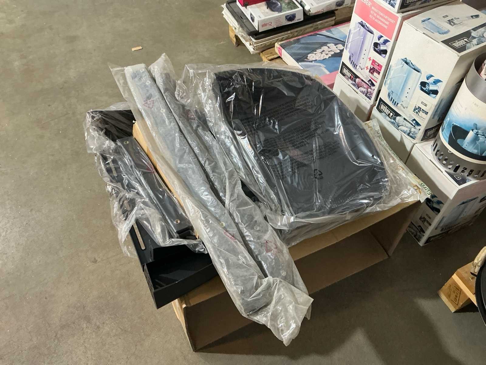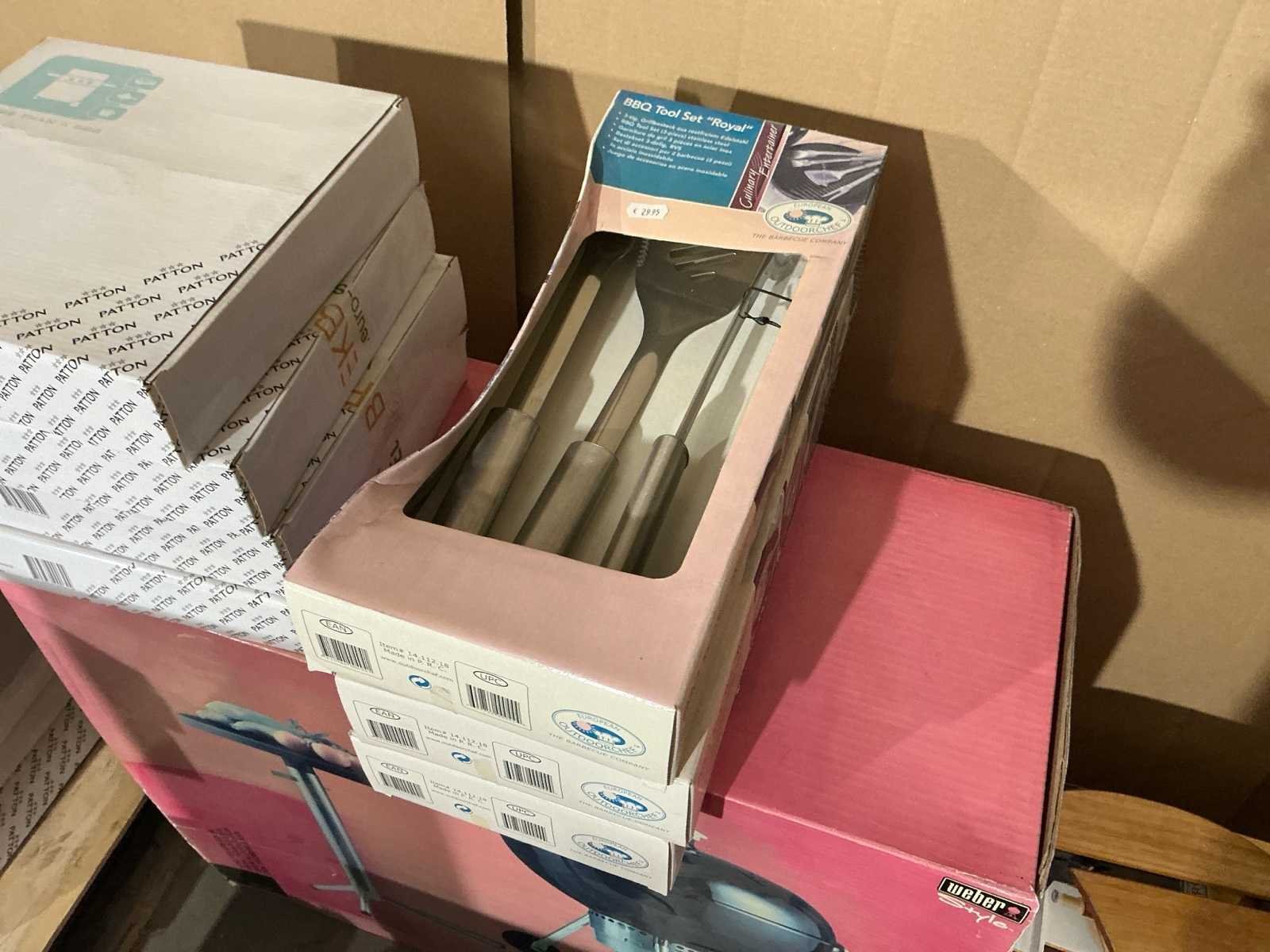 Bestaat uit: 3 pallets met barbecue benodigdheden, Weber briketten starter 7 stuks, Weber vinyl cover 4 stuks, Weber magneet messenhiuder, 2x gourmetset, Patton wok7 stuks, Patton connectie set 4x, Patton borstels, BBQ tangen, Patton spatel 6x, 9 side table, BBQ short 2x, kist aanmaak blokjes, recepten boeken, Patton fish-grill,Weber digitale thermometer, 2 stuks wok set, Weber BBQ, BBQ handschoenen, Nee Merk: Weber Model: Diversen
