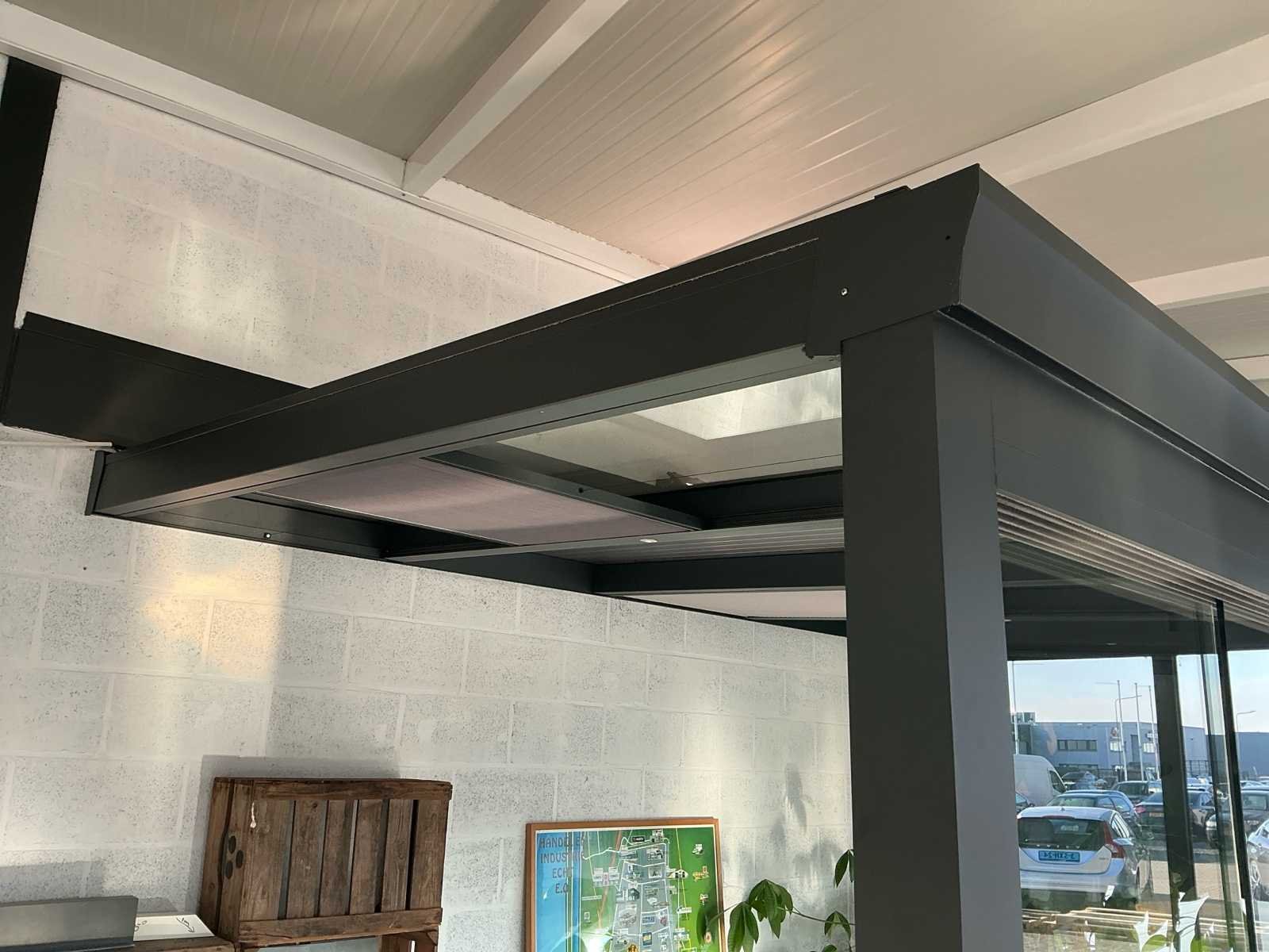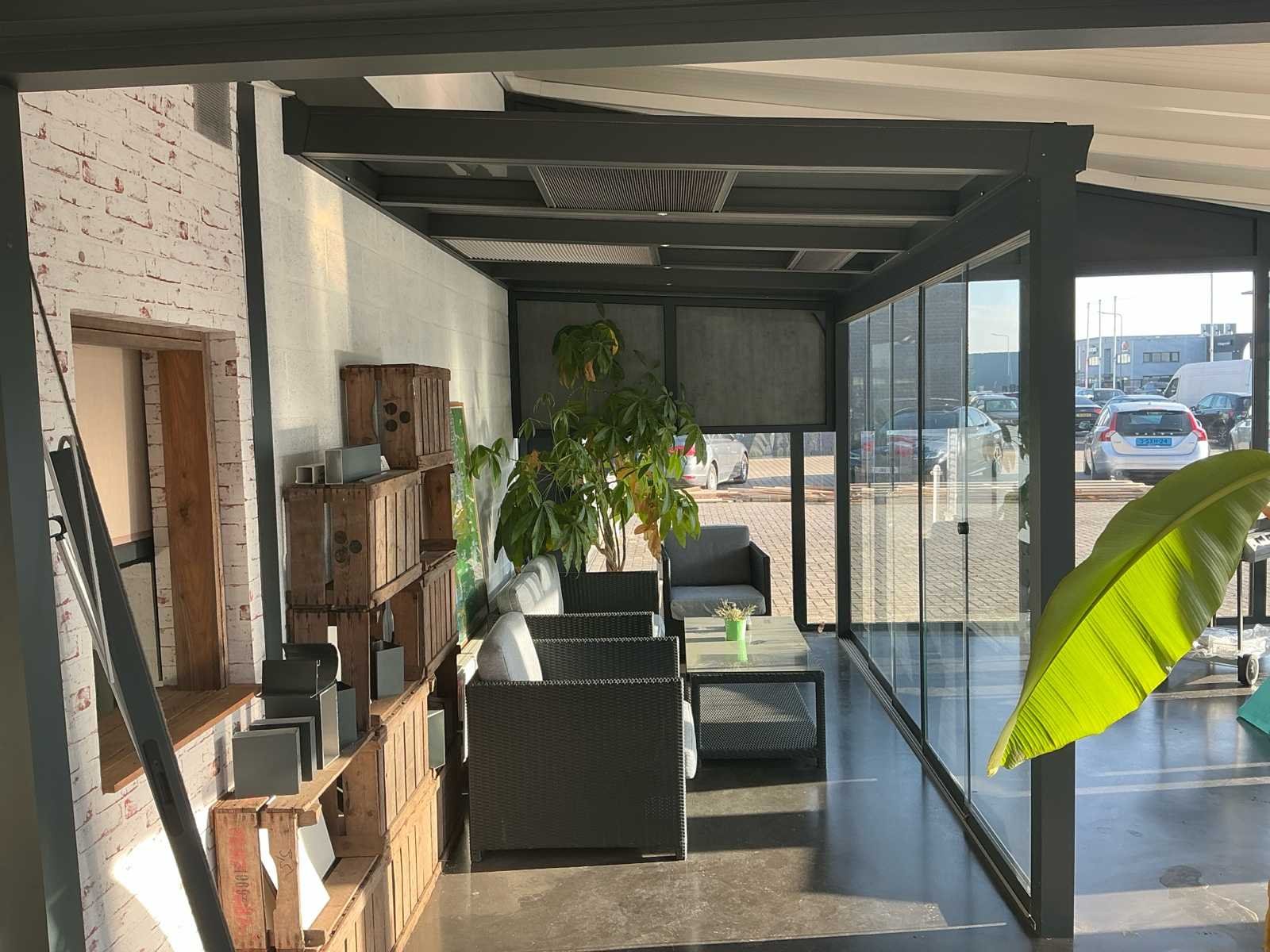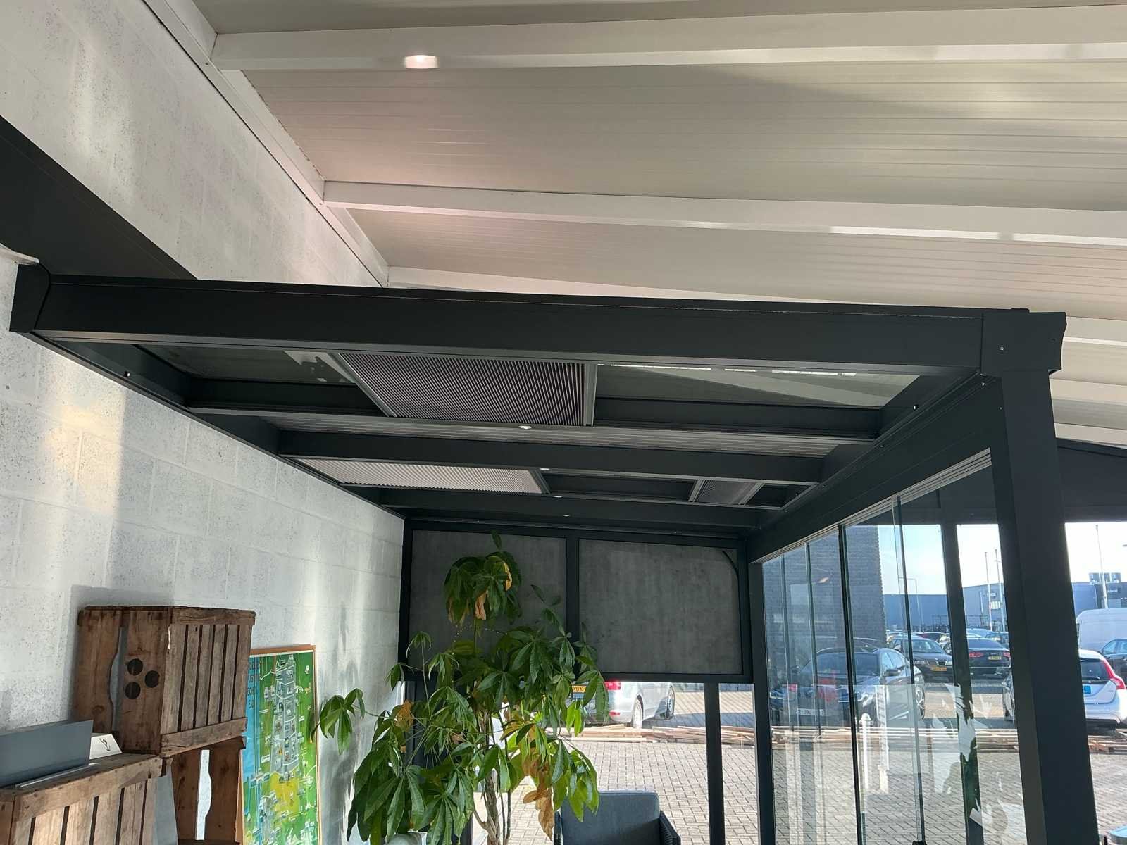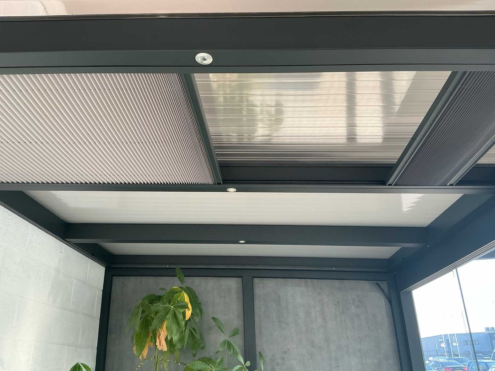 Bestaat uit: overkapping aluminium antraciet, 5 stuks schuifdeuren, geleide rail, ingebouwde spotjes 4 stuks, zonwering in 2 dakvlakken, hoogste punt bovenzijde 2620, laagste zijde bovenkant 2420mm, 2320mm breed buitenzijde, rechte zijde op 1420mm hoogte dicht, 5 dakramen, diverse uitvoering polycarbonaat, ingebouwde goot voorzijde, afvoer in kolom, breedte rail schuifdeuren 100mm, Wordt gedemonteerd door verkoper bij aankoop, wordt verkocht zonder accessoires die in de overkapping staan!. Nee Merk: Terras overkapping Kleur: Antraciet Lengte: 4110cm Breedte: 2320cm Hoogte: 2420cm Materiaal: Aluminium