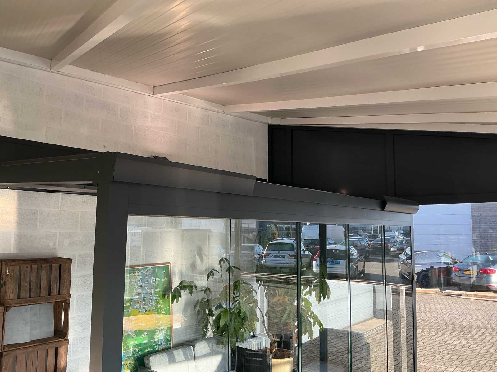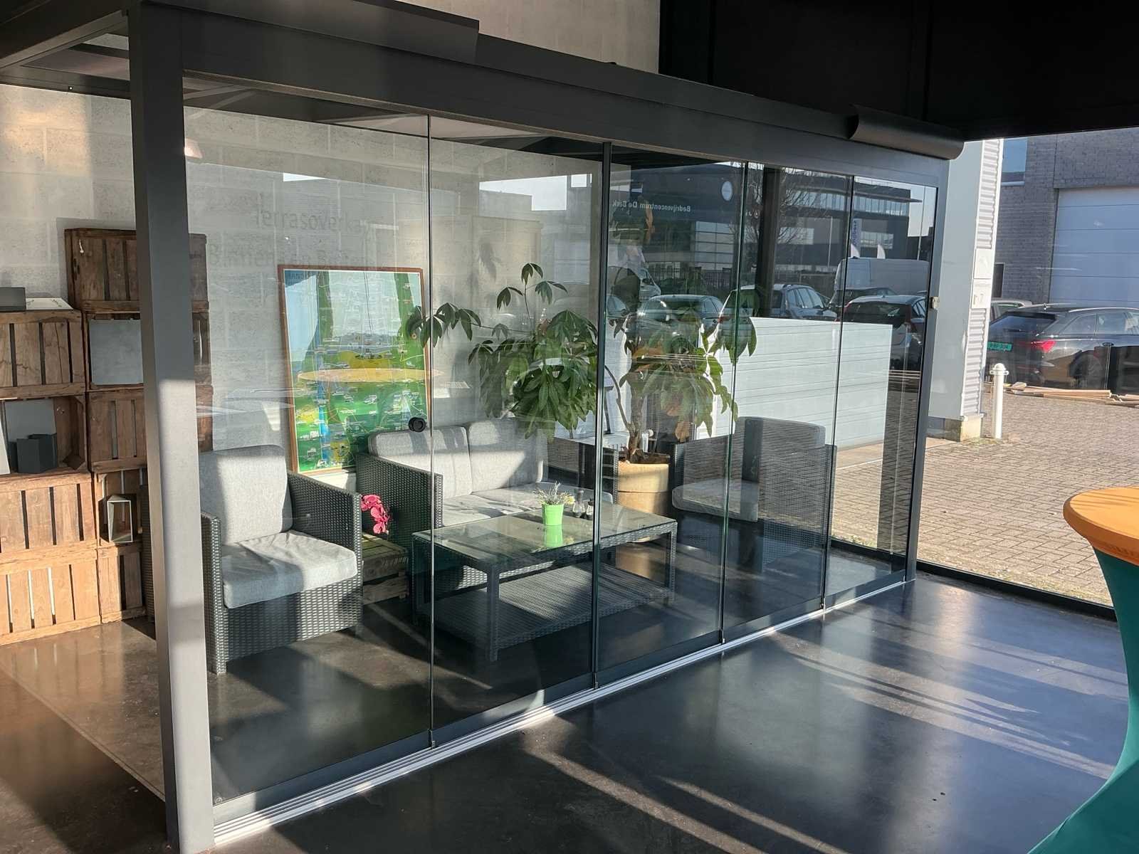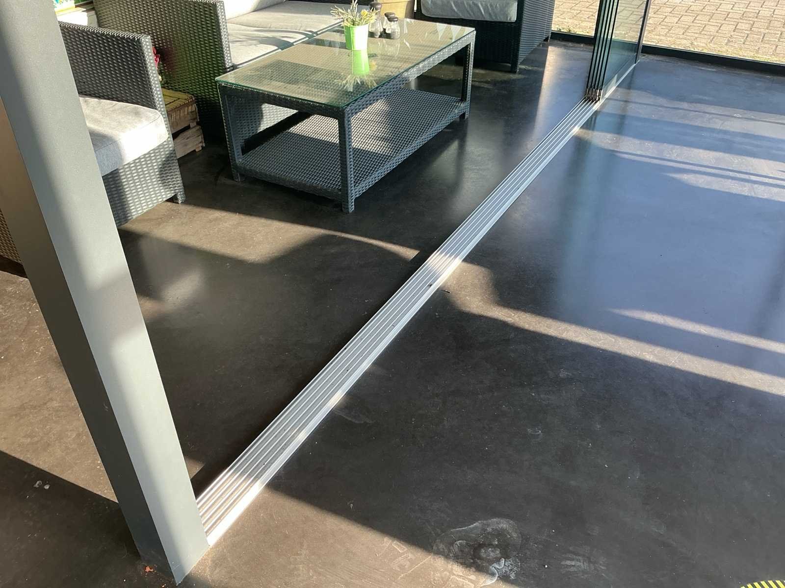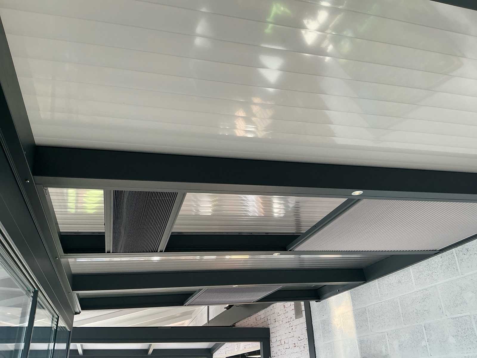Bestaat uit: overkapping aluminium antraciet, 5 stuks schuifdeuren, geleide rail, ingebouwde spotjes 4 stuks, zonwering in 2 dakvlakken, hoogste punt bovenzijde 2620, laagste zijde bovenkant 2420mm, 2320mm breed buitenzijde, rechte zijde op 1420mm hoogte dicht, 5 dakramen, diverse uitvoering polycarbonaat, ingebouwde goot voorzijde, afvoer in kolom, breedte rail schuifdeuren 100mm, Wordt gedemonteerd door verkoper bij aankoop, wordt verkocht zonder accessoires die in de overkapping staan!. Nee Merk: Terras overkapping Kleur: Antraciet Lengte: 4110cm Breedte: 2320cm Hoogte: 2420cm Materiaal: Aluminium