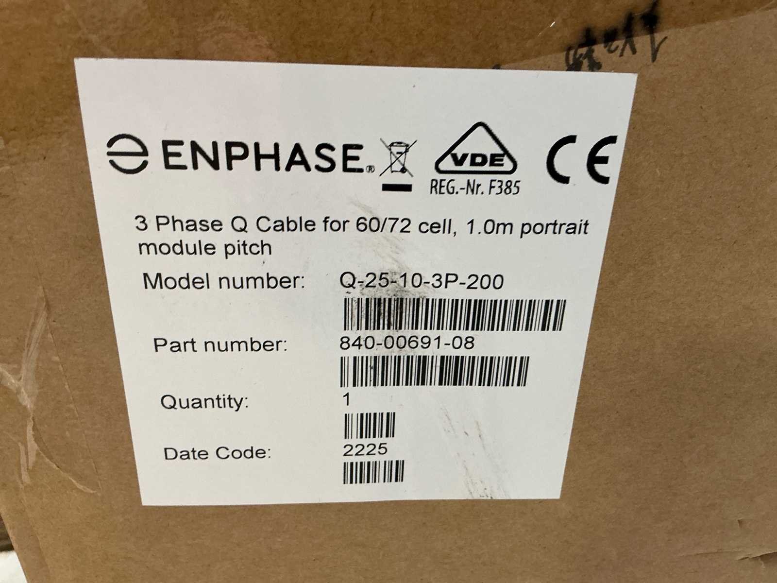 Voorzien van: 60 x 3-fase kabel landscape, 180x 3-fase portrait Nee Merk: Enphase Model: Q cable Product type: 3-fase Kleur: Zwart Lengte: 170cm