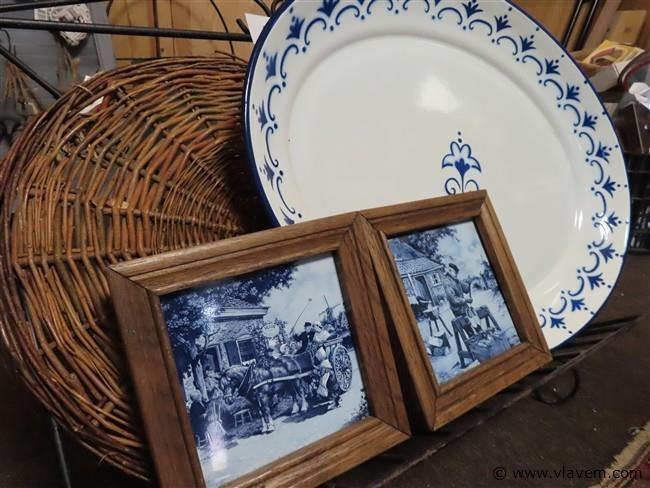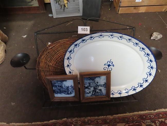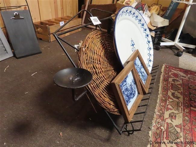 Metalen boekenstaander, emaille schaal enz….