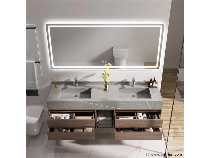 Aantal: 1 Merk: Vonato Productnaam: Badkamermeubel Type: MBY-415 Model: 2-persoons badkamermeubel 150 cm donker hout decor met marmeren wasbak Kranen: Inclusief 2 opzetkranen Materiaal: Meubel: Multiplex met melamine, Wasbak: Marmer Afmeting: 2-persoons set: 1 * Wastafelmeubel - 1500x550x550mm 1 * Spiegel - ca. 1500x700mm Kleur: Donker hout decor, grijze wasbak Voorzien van: Softclose lade systeem: 4 lades - Kranen inclusief pop-up afvoer - Spiegel met touchscreen LED-verlichting en anti-fog technologie - Voorgemonteerd wastafelmeubel. Conditie: Nieuw Ter waarde van: € 2.395,00