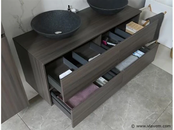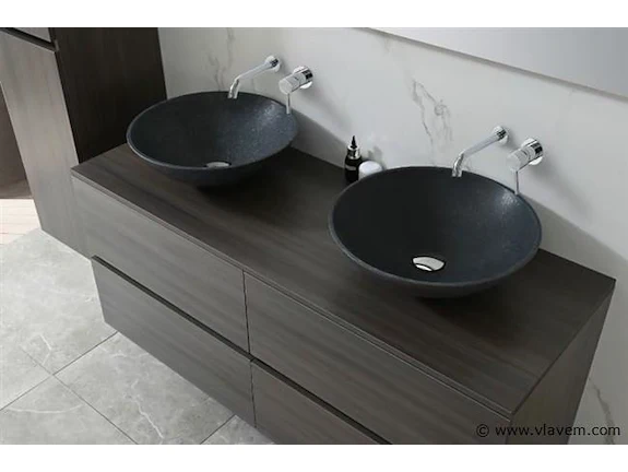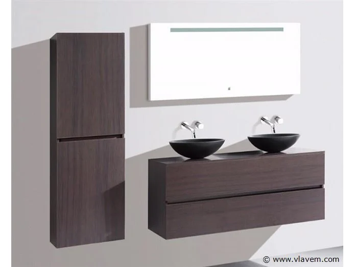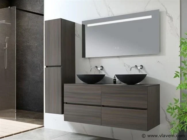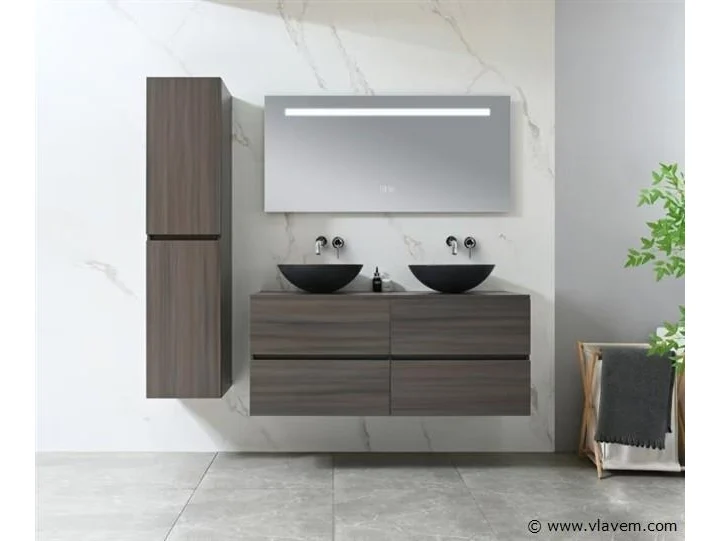 Aantal: 1 Merk: Vonato Productnaam: Badkamermeubel 2 persoons Type: 9010 Model: 3-delig met waskommen Kleur: Donker hout decor, zwarte kommen Materiaal: Melamine, stenen waskommen Afmeting: 3-delige set: 1 * Wastafelmeubel - 1300x470x550mm 1 * Zijkast - 1500x350x350mm 1 * Spiegel- 1300x600mm Voorzien van: Muurkranen inclusief pop-up afvoer – 4 stevige metalen lades - Softclose lade systeem – Stenen waskommen - LED spiegel - Voorgemonteerde zijkast en wastafelmeubel. Conditie: Nieuw