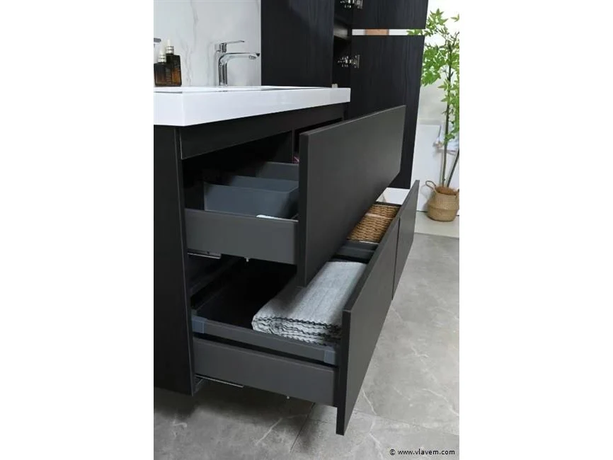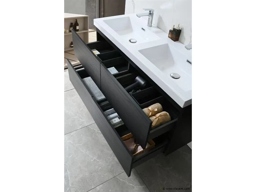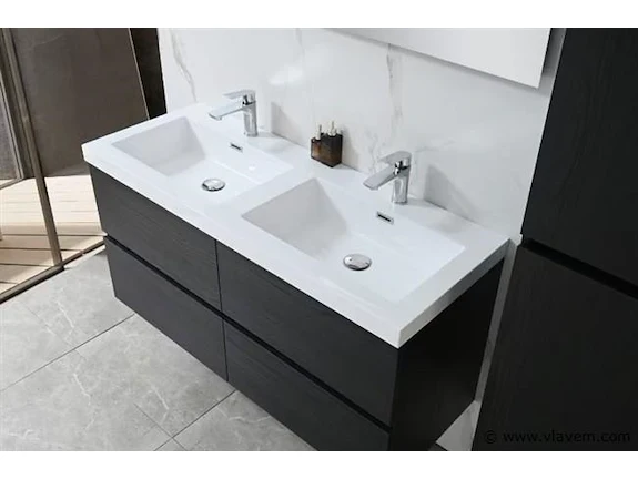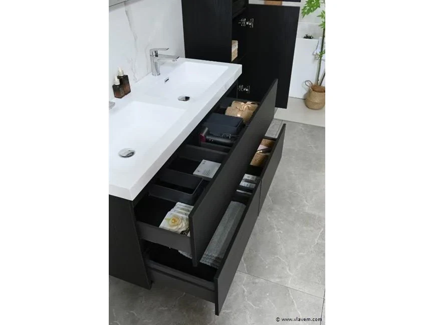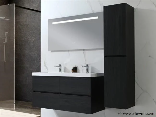 Aantal: 1 Merk: Vonato Productnaam: Badkamermeubel 2 persoons Type: 9015 Model: 3-delig met dubbele wasbak Kleur: Donker hout decor zwart, witte wastafel Materiaal: Melamine, kunstmarmeren wastafel Afmeting: 3-delige set: 1 * Wastafelmeubel - 1200x450x600mm 1 * Zijkast - 1500x350x350mm 1 * Spiegel- 1200x600mm Voorzien van: Kranen inclusief pop-up afvoer – 4 stevige metalen lades - Softclose lade systeem - LED spiegel met anti-fog systeem - Voorgemonteerde zijkast en wastafelmeubel. Conditie: Nieuw