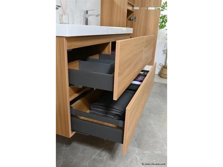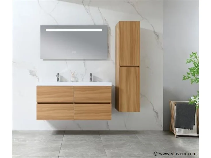 Aantal: 1 Merk: Vonato Productnaam: Badkamermeubel 2 persoons Type: 9015H Model: 3-delig met dubbele wasbak Kleur: Licht hout decor zwart, witte wastafel Materiaal: Melamine, kunstmarmeren wastafel Afmeting: 3-delige set: 1 * Wastafelmeubel - 1200x450x600mm 1 * Zijkast - 1500x350x350mm 1 * Spiegel- 1200x600mm Voorzien van: Kranen inclusief pop-up afvoer – 4 stevige metalen lades - Softclose lade systeem - LED spiegel met anti-fog systeem - Voorgemonteerde zijkast en wastafelmeubel. Conditie: Nieuw