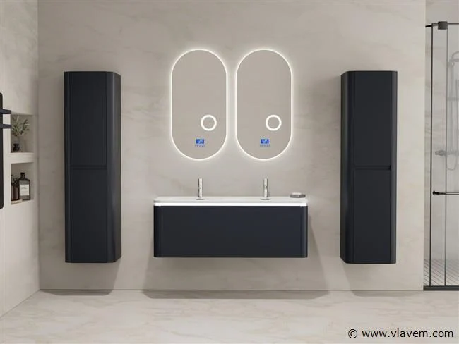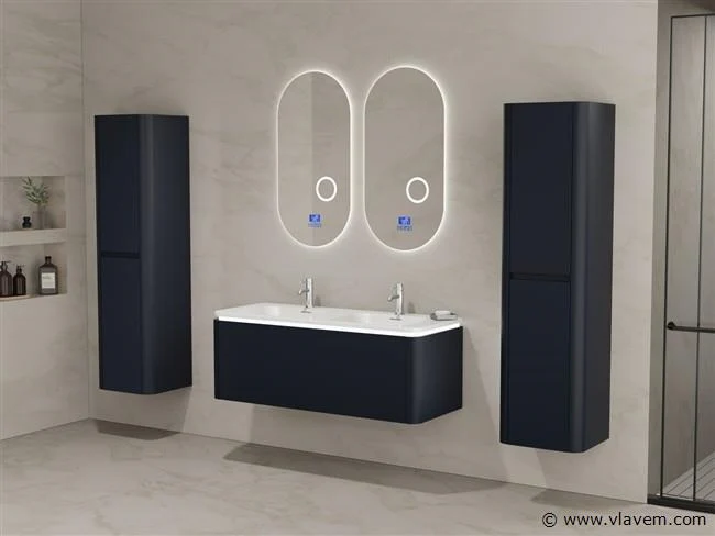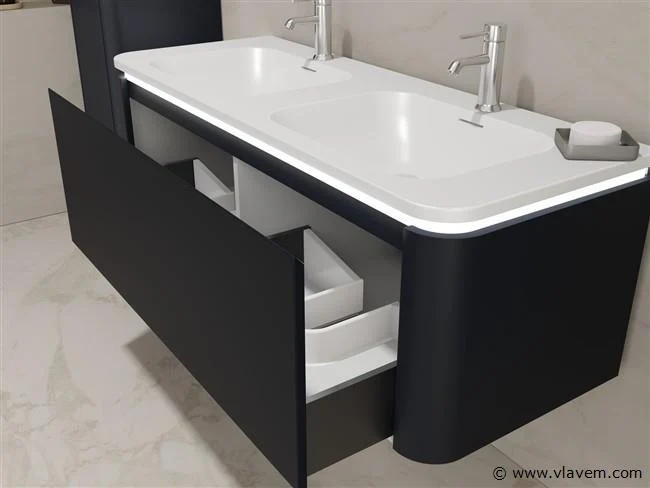 Aantal: 1 Merk: Vonato Type: BOSTON1202-BL Model: Badkamermeubel 2 persoons 120 cm Kranen: Incl. 2 kranen Materiaal: Melamine en MDF Afmetingen Complete set: 1 * Wastafelmeubel - 1200x455x400mm, 1 * Dubbele wasbak - 1205x460x190mm, 2 * Zijkast - 1500x350x350mm, 2 * Spiegel- 450x900mm Kleur: Zwart Voorzien van: LED verlichting in onderkast - 2 kranen inclusief pop-up afvoer – 1 lade met 2 opbergvakken - Softclose lade systeem – 2 LED spiegels met anti-fog systeem - Voorgemonteerde zijkasten en wastafelmeubel. Conditie: Nieuw