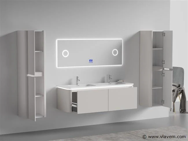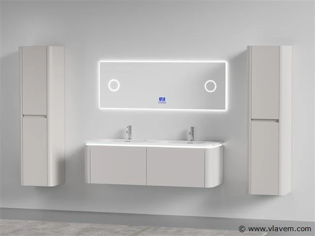 Aantal: 1 Merk: Vonato Type: BOSTON1401-TA Model: Badkamermeubel 2 persoons 140 cm Kranen: Incl. 2 kranen Materiaal: Melamine en MDF Afmetingen Complete set: 1 * Wastafelmeubel - 1400x455x400mm, 1 * Dubbele wasbak - 1405x460x190mm, 2 * Zijkast - 1500x350x350mm, 1 * Spiegel- 1400x600mm Kleur: Taupe Voorzien van: LED verlichting in onderkast - 2 kranen inclusief pop-up afvoer – 2 lades - Softclose lade systeem - LED spiegel met anti-fog systeem - Voorgemonteerde zijkasten en wastafelmeubel. Conditie: Nieuw