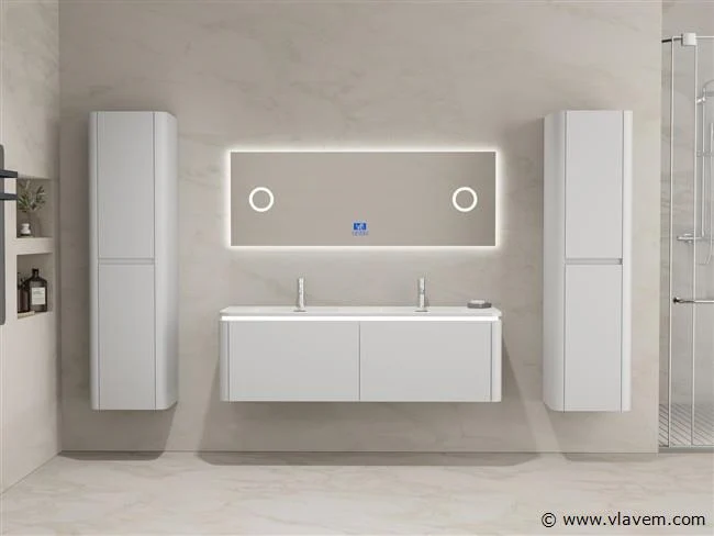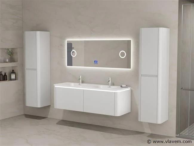 Aantal: 1 Merk: Vonato Type: BOSTON1401-WH Model: Badkamermeubel 2 persoons 140 cm Kranen: Incl. 2 kranen Materiaal: Melamine en MDF Afmetingen Complete set: 1 * Wastafelmeubel - 1400x455x400mm, 1 * Dubbele wasbak - 1405x460x190mm, 2 * Zijkast - 1500x350x350mm, 1 * Spiegel- 1400x600mm Kleur: Wit Voorzien van: LED verlichting in onderkast - 2 kranen inclusief pop-up afvoer – 2 lades - Softclose lade systeem - LED spiegel met anti-fog systeem - Voorgemonteerde zijkasten en wastafelmeubel. Conditie: Nieuw