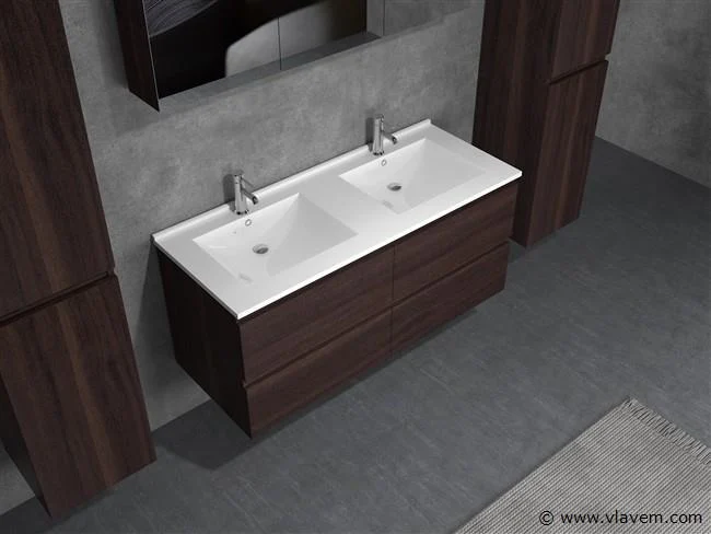 Aantal: 1 Merk: Vonato Productnaam: Badkamermeubel Type: HAVIKLUXWM-2-120-H084 Model: 2-persoons badkamermeubel 120 cm - donker hout decor met witte wasbak Kranen: Inclusief Afmeting: 2-persoons set: 1 * Wastafelmeubel - 1200x455x520mm 1 * Dubbele wasbak – 1200x460x160mm (rand 2 cm) 2 * Zijkasten - 1500x350x350mm 1 * Spiegelkast - 1200x450x180mm Kleur: Donker hout decor Materiaal: 16 mm MFC Voorzien van: Kranen inclusief pop-up afvoer – 4 lades - Softclose systeem op deurtjes en lades - Giethars wasbakken – LED verlichting boven de spiegel – Spiegelkast met 3 deurtjes en 2 planken - Voorgemonteerde zijkasten en wastafelmeubel. Conditie: Nieuw Ter waarde van: € 3.495,00