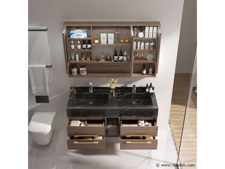 Aantal: 1 Merk: Vonato Productnaam: Badkamermeubel Type: MBY-312 Model: 2-persoons badkamermeubel 120 cm donker hout decor met marmeren wasbak Kranen: Inclusief 2 opzetkranen Materiaal: Meubel: Multiplex met melamine, Wasbak: Marmer Afmeting: 2-persoons set: 1 * Wastafelmeubel - 1200x550x550mm 1 * Spiegel - ca. 1200x700mm Kleur: Donker hout decor, zwarte wasbak Voorzien van: Softclose lade systeem: 4 lades - Kranen inclusief pop-up afvoer - Spiegel met touchscreen LED-verlichting en anti-fog technologie - Opbergruimte in de spiegel - Voorgemonteerd wastafelmeubel. Conditie: Nieuw Ter waarde van: € 2.195,00