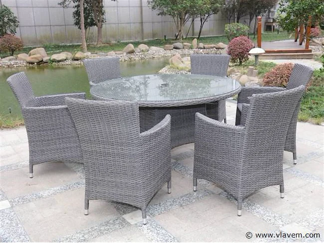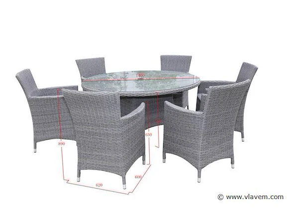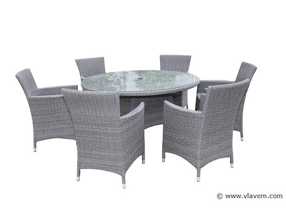 Aantal: 1 Merk: Vonato Productnaam: Diningset Type: LEON-1603 Model: 7-delig Frame: Aluminium frame Kleur: Grijs wicker met grijze kussens Afmeting: 7-delige set: 6 * stoelen, 1 * ronde tafel met glazen blad: ø 140cm x 75 cm hoog. Voorzien van: Waterafstotende kussens - weerbestendig vlechtwerk – Gepoedercoat aluminium frame – Glazen tafelblad - Gat in tafel voor parasol. Conditie: Nieuw