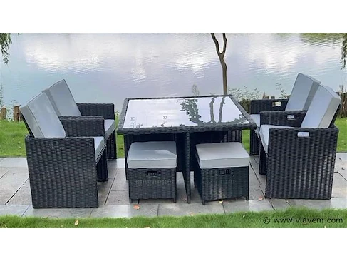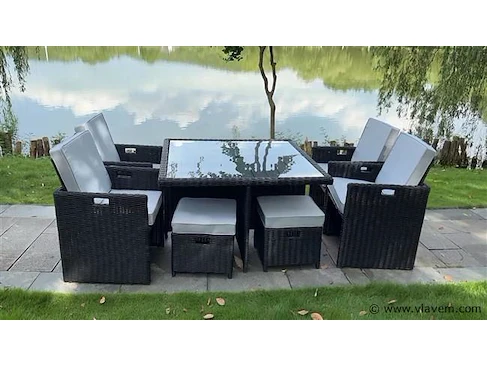 Aantal: 1 Merk: Vonato Productnaam: Diningset Type: NEVADA-26-BL Kleur: Black wicker, witte kussens Model: 9-delige diningset Afmetingen: 9-delige set: 1* table 125*125*75cm 4* chair 60*60*68/93cm 4* ottoman 45*45*36cm Frame: Gepoedercoat aluminium frame - garandeert een langere levensduur Voorzien van: weerbestendig vlechtwerk Conditie: Nieuw