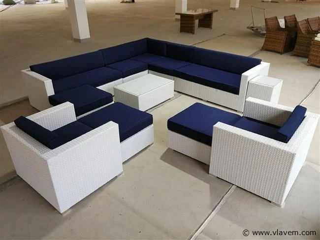 Aantal: 1 Merk: Vonato Productnaam: Loungeset Type: ESR15023-WHITE-BLUE Model: 12-delig Kleur: Wit wicker met donkerblauwe kussens Afmeting: 12-delige set: 2 * Losse fauteuils - 940x820x670mm 2 * Middendeel - 700x820x670mm 2 * Twee-zitter met armleuning - 1520x820x670mm 1 * Hoekdeel - 820x820x670mm 3 * Hockers - 700x700x300mm 1 * Salontafel - 940x640x350mm - Helder glazen tafelblad 5mm 1 * Bijzettafel - 400x400x600mm - Helder glazen tafelblad 5mm Kussens - 100mm dik Frame: Gepoedercoat aluminium frame - garandeert een langere levensduur Voorzien van: Waterafstotende kussens - weerbestendig vlechtwerk Conditie: Nieuw Ter waarde van: € 4.595,00