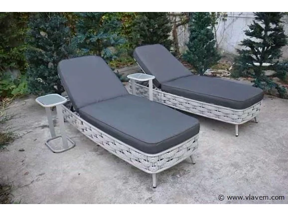 Aantal: 1 Merk: Vonato Productnaam: Ligbeddenset Type: RT276 Model: 4-delig Kleur: Wit wicker met antraciete kussens Afmeting ligbedden: 206x72x34 cm Frame: Gepoedercoat aluminium frame - garandeert een langere levensduur Bijzonderheden: Twee comfortabele ligbedden - Twee bijzettafeltjes - Waterafstotende kussens dikte 10 cm - Weerbestendig vlechtwerk - 180 grams waterproof bekleding Conditie: Nieuw Ter waarde van: € 1.195,00