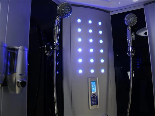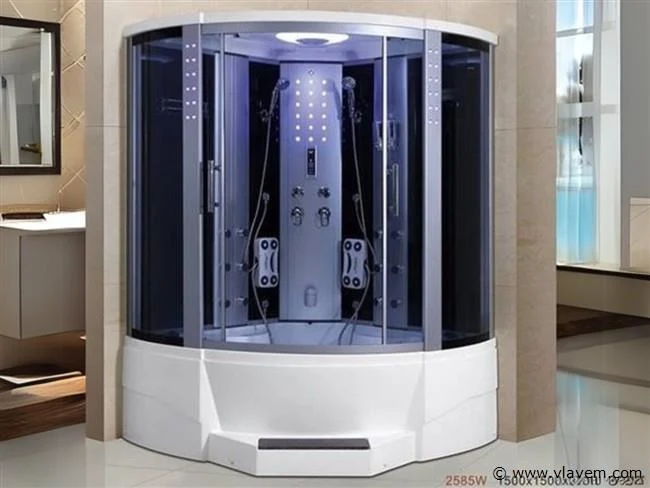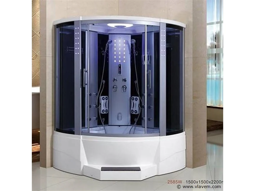 Aantal: 1 Merk: Vonato Productnaam: Stoomcabine met massagebad Type: 2585W Model: Massagebad - Halfrond Afmeting: 1500x1500x2200mm Waterjets: 6 Waterjets zorgen voor een aangename rugmassage. Voorzien van: Getint veiligheidsglas - Schuifdeuren met waterdichte afsluiting - Hand- en regendouche - Digitaal bedieningspaneel - Sfeerverlichting - FM-radio met speaker en CD-aansluiting - Port om de telefoon op aan te sluiten - Antislip bodem - Ventilator - Cabine staat op verstelpoten die eenvoudig te stellen zijn in hoogte. Conditie: Nieuw Ter waarde van: € 5.595,00