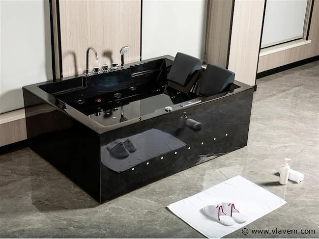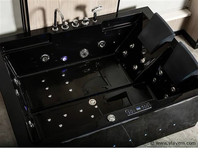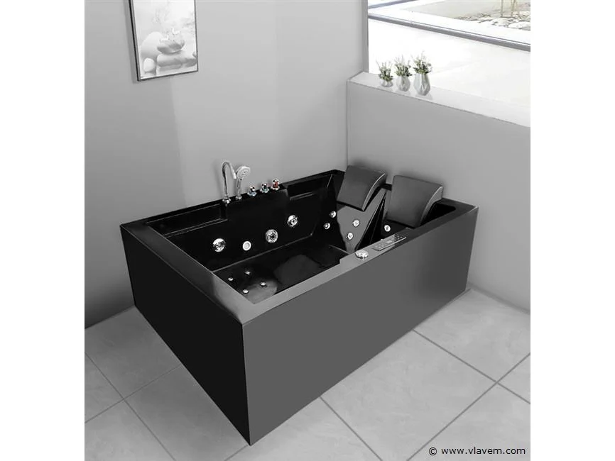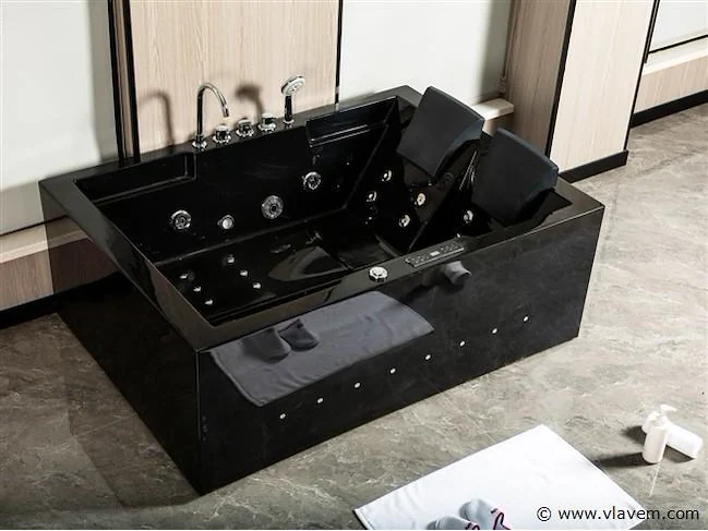 Aantal: 1 Merk: Vonato Productnaam: Massagebad Type: LF12171B Model: Rechthoekig, tweepersoons Afmeting: 1700x1200x650mm Kleur: Zwart Waterjets: 8 Whirlpool jets rug - 6 extra whirlpool jets - 16 Airbubble jets. Voorzien van: Thermostatische waterkranen - Handdouche - 2 kussens - Bluetooth - Bedieningspaneel D4 FM - Heater - Ozone desinfectie - Overloop - Afvoer - Chroom kleurige kraan en knoppen - Gekleurde onderwaterverlichting Conditie: Nieuw