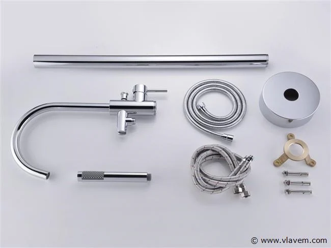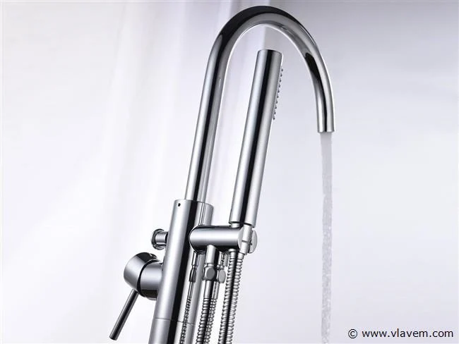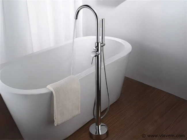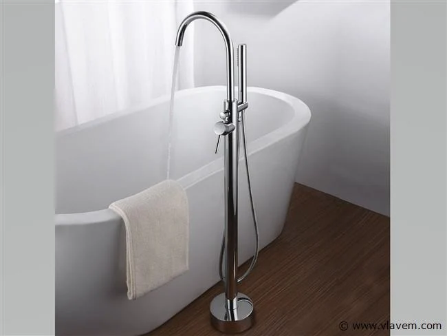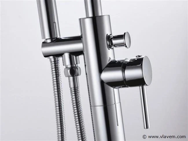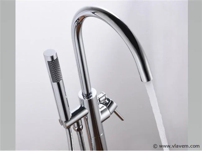Aantal: 1 Merk: Vonato Productnaam: Vrijstaande badkraan Type: FAUCET CHROME Model: Vrijstaand Kleur: Zilver (chroom) Afmetingen: De kraan is 111 cm hoog en de breedte is ca. 25 cm Voorzien van: Uitneembare handdouche - Buis, handdouche en beugel van messing - 360 graden draaibare uitloop. Conditie: Nieuw Ter waarde van: € 795,-