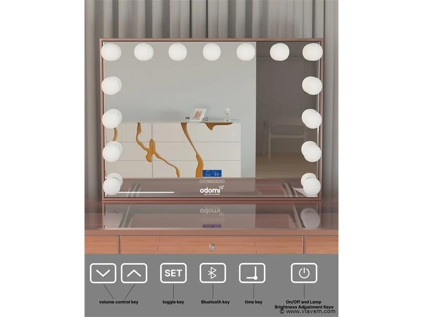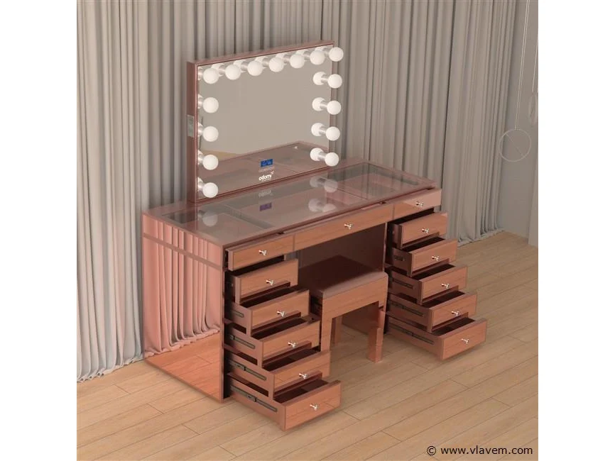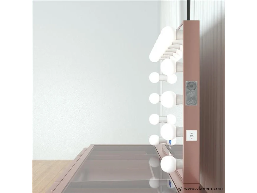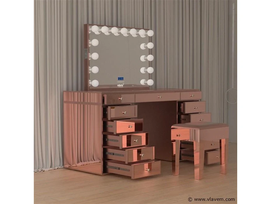 Aantal: 1 Merk: Vonato Productnaam: Kaptafel Type: LG010-RG Model: Kaptafel met spiegel en kruk Kleur: Hoogglans roze Verlichting: 15 stuks, 12V Materiaal: Geverfd MDF, gehard glazen blad Afmeting: complete set: 1 * Tafel: 1500x600x810mm 1 * Spiegel: 1000x800mm 1 * Kruk: 350x400mm Voorzien van: Verlichting met 3 standen – Touchbuttons – USB en type C aansluitingen – Muziek luisteren via Bluetooth functie - Helder gehard glazen tafelblad – 13 lades. Conditie: Nieuw