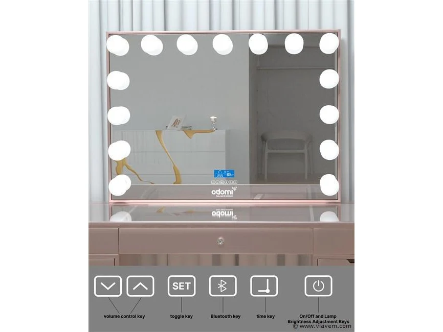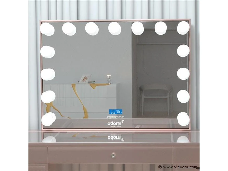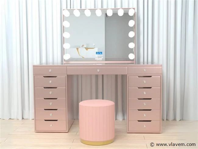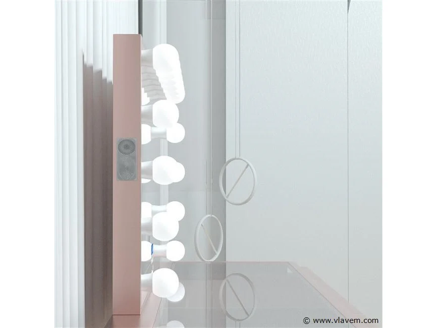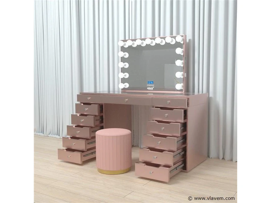 Aantal: 1 Merk: Vonato Productnaam: Kaptafel Type: LG02-RG Model: Kaptafel met spiegel en kruk Kleur: Roze Verlichting: 15 stuks, 12V Materiaal: Geverfd MDF, gehard glazen blad Afmeting: complete set: 1 * Tafel: 1500x600x810mm 1 * Spiegel: 1000x800mm 1 * Kruk: 350x400mm Voorzien van: Verlichting met 3 standen – Touchbuttons – USB en type C aansluitingen – Muziek luisteren via Bluetooth functie - Helder gehard glazen tafelblad – 13 lades. Conditie: Nieuw