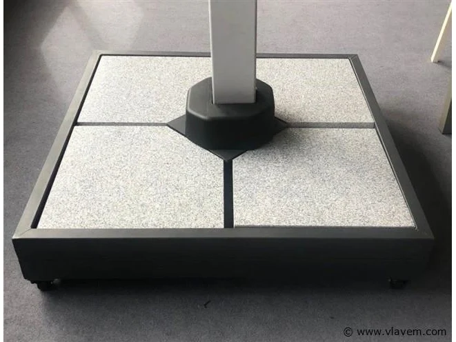 Aantal: 1 Merk: Vonato Productnaam: Parasolvoet Type: BASE100X100 Afmeting: 100x100 cm Model: Parasolvoet met wielen voor 4-dubbele parasol Kleur: Zwart Materiaal: Staal Productbeschrijving: Stevige stalen parasolvoet, gemaakt voor vierdubbele parasol. Makkelijk te verrijden met de wieltjes. Exclusief stenen, zelf nog te verzwaren met 4 tegels. Conditie: Nieuw Ter waarde van: € 695,00