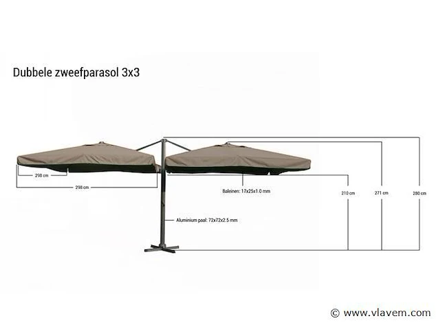 Aantal: 1 Merk: Vonato Productnaam: Parasol Type: U1073 DOUBLE 3X3 SANDY Afmeting: 2x 3000x3000mm Model: Dubbel hangend Kleur: Zandkleurig Materiaal: Aluminium frame, 200 gram/m2 brandvertragend doek Productbeschrijving: De parasol is ideaal voor gebruik in de tuin, terras en balkon. De grote parasol wordt geleverd met een parasolvoet. Deze moet wel worden verzwaard met behulp van bijvoorbeeld terrastegels. Houd hiervoor minimaal een gewicht van 100 kilo aan. Voorzien van: Groot dubbel parasoldoek met een afmeting van tweemaal ø300 cm. - Sterk en stevig frame gemaakt van aluminium. - Eenvoudig startklaar te zetten voor gebruik. - Brandvertragend, dik doek voor een betere UV-bescherming. - De parasol houdt de warmte van de zon vast waardoor het ook ’s avonds nog lekker warm is wanneer de zon ondergaat. - De parasol kan 360 graden om zijn as draaien, zo kan de parasol makkelijk meedraaien met de zon en maak je optimaal gebruik van de parasol. Conditie: Nieuw Ter waarde van: € 1.495,00