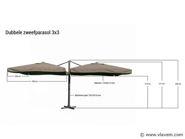Aantal: 1 Merk: Vonato Productnaam: Parasol Type: U1073 DOUBLE 3X4 DG LUX Afmeting: 2 * 3000x4000mm (3000 mm breed, 4000 mm diep) Model: Dubbel hangend Kleur: Donkergrijs Materiaal: Aluminium frame, 300 gram/m2 brandvertragend doek Productbeschrijving: De parasol is ideaal voor gebruik in de tuin, terras en balkon. De grote parasol wordt geleverd met een parasolvoet. Deze moet wel worden verzwaard met behulp van bijvoorbeeld terrastegels. Houd hiervoor minimaal een gewicht van 100 kilo aan. Voorzien van: Groot dubbel parasoldoek met een afmeting van 2 * 300x400 cm - UV-bescherming van 50+ - Kleurvaste doeken - Vuil- en waterafstotend door de PU-coating - Sterk en stevig frame gemaakt van aluminium. - Eenvoudig startklaar te zetten voor gebruik. - Inclusief parasolvoet. - Brandvertragend, dik doek - De parasol houdt de warmte van de zon vast waardoor het ook ’s avonds nog lekker warm is wanneer de zon ondergaat. - De parasol kan 360 graden om zijn as draaien, zo kan de parasol makkelijk meedraaien met de zon en maak je optimaal gebruik van de parasol. Conditie: Nieuw Ter waarde van: € 1.695,00
