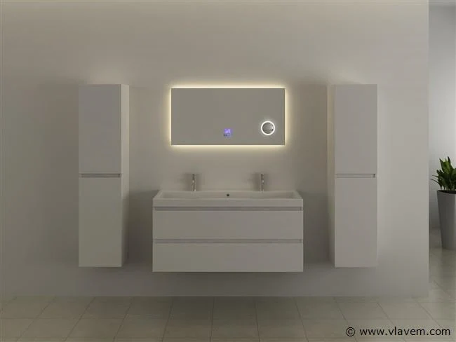 Aantal: 1 Merk: Vonato Productnaam: Badkamerspiegel Type: RALM-100 Model: Rechthoekige spiegel met LED verlichting Afmetingen: 1000x500x5 mm Kleur: LED verlichting in 3 kleuren; geel, blauw en wit Voorzien van: Touch bediening via digitaal display – LED verlichting in 3 kleuren, dimbaar – Bluetooth & speakers – Digitale klok – Digitale temperatuurmeter – 220 volt aansluiting – Anti-fog technologie door verwarming in de spiegel – Vergrootglas (vergroot 3x) in de spiegel Ø10 cm - Kopervrije spiegel - 1,5mm explosieveilige laag aan de achterkant. Conditie: Nieuw Ter waarde van: € 395,-