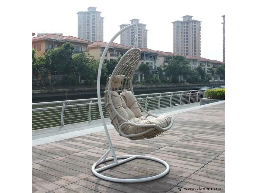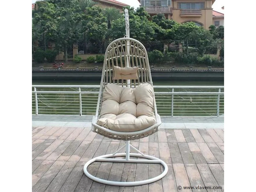 Aantal: 1 Merk: Vonato Productnaam: hangstoel Type: SWING-71 Kleur: Wit frame / mokka kussens Model: Hangstoel Afmetingen: basket: W80*H110*D75CM pole: H195CM Base: 95CM Conditie: Nieuw