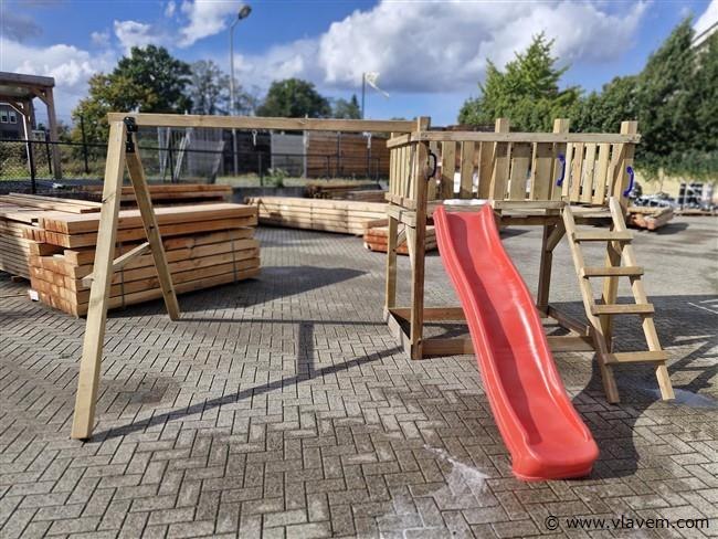 Vloerhoogte 125cm. Materiaal: palen & schommel 88x88mm, glijbaan kunststof kleur rood, geleverd incl..2 st handvast-4 schommelhaken-1 st grond ankers voor palen van schommel te verankeren. geleverd incl. bevestigingsmateriaal en handleiding. Geleverd in een bouwpakket.