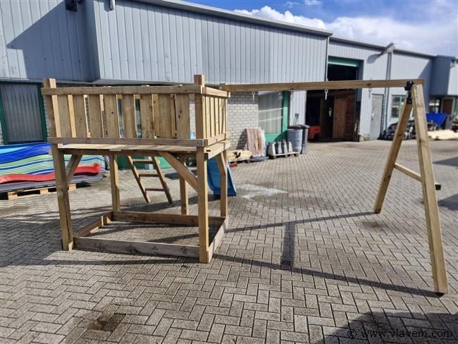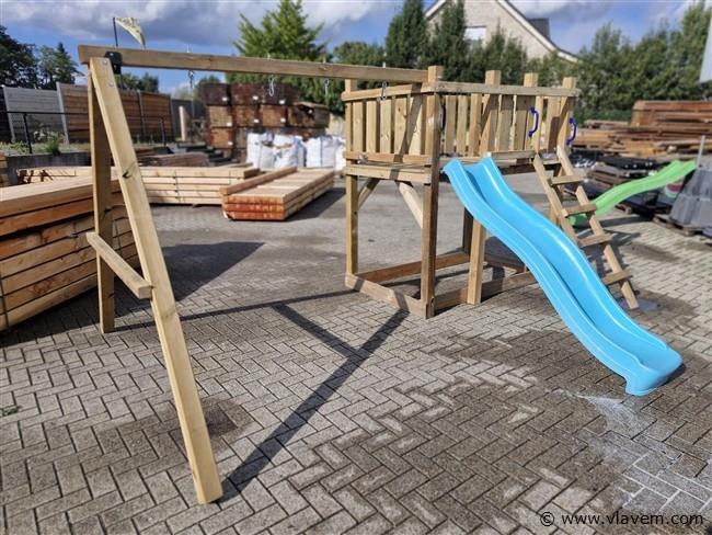 Vloerhoogte 125cm. Materiaal: palen & schommel 88x88mm, glijbaan kunststof kleur blauw, geleverd incl..2 st handvast-4 schommelhaken-1 st grond ankers voor palen van schommel te verankeren. geleverd incl. bevestigingsmateriaal en handleiding. Geleverd in een bouwpakket.